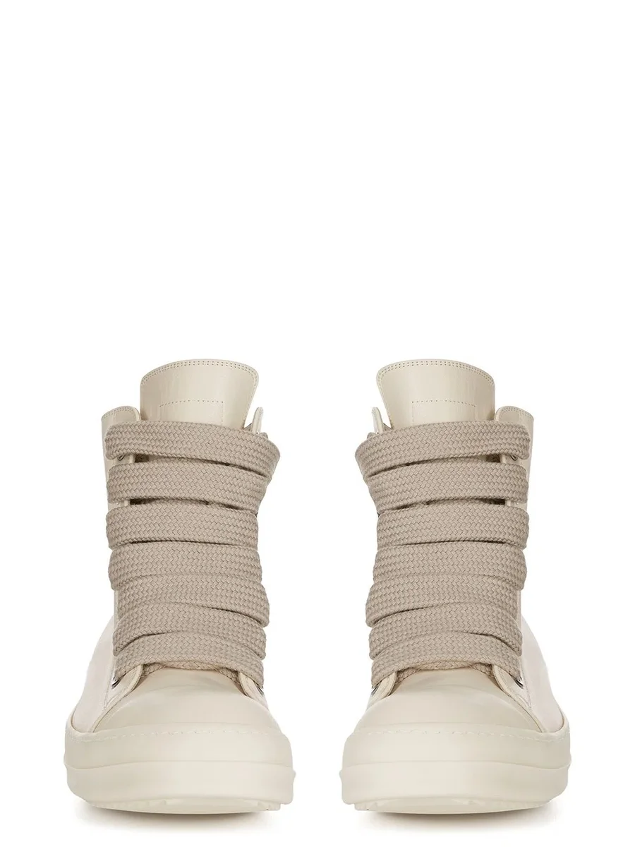 THESE JUMBOLACE SNEAKERS ARE ABOVE-ANKLE HEIGHT AND FEATURE EYELETS, JUMBO LACES, A ZIPPER ON THE INSIDE ANKLE FOR EASY FASTENING, TOE CAPS AND SHARK-TOOTHED BUMPER SOLES.