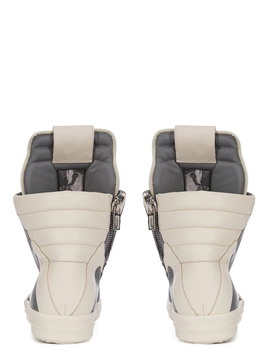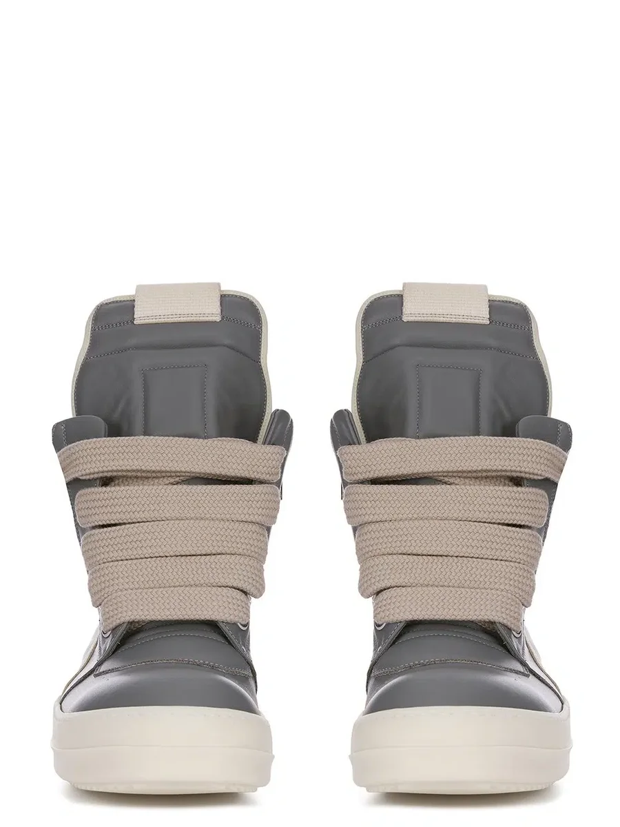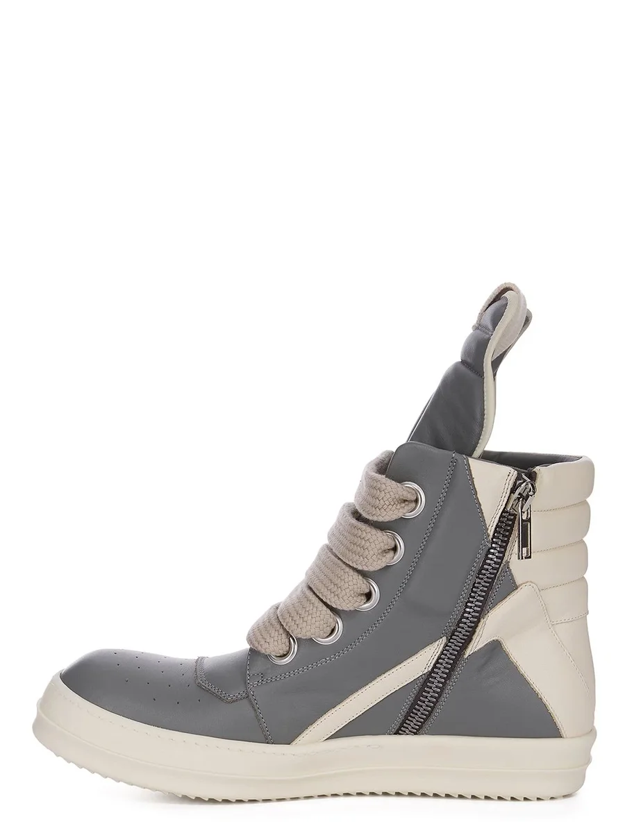 THESE JUMBOLACE GEOBASKETS ARE ABOVE-ANKLE HEIGHT. THEY FEATURE AN EXTENDED TONGUE WITH WEBBING TAB, SIGNATURE GEOMETRIC PANELS AND A PADDED BACK COUNTER WITH LINES OF TOPSTITCHING. THEY HAVE JUMBO LACES, A ZIPPER ON THE INSIDE ANKLE FOR EASY FASTENING AND SHARK-TOOTHED BUMPER SOLES.
