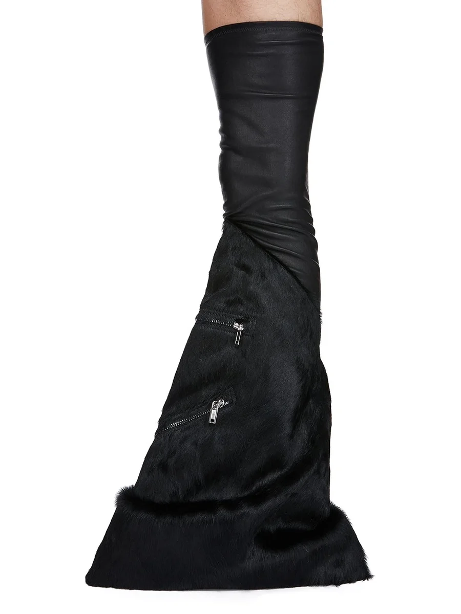 THESE CARGO FETISH SNEAKS ARE ABOVE-KNEE HIGH WITH A STRETCH LEATHER TOP. THEY HAVE A BOOT SHAPED UPPER WITH AN ADDITIONAL LAYER FALLING FROM AN ASYMMETRICAL SEAM LINE, GRAZING THE FLOOR. THEY FEATURE TWO FRONT ZIPPERS, ONE HORIZONTAL AND ON ANGLED. THEY HAVE MILK TOE CAPS AND SHARK TOOTH SOLES.