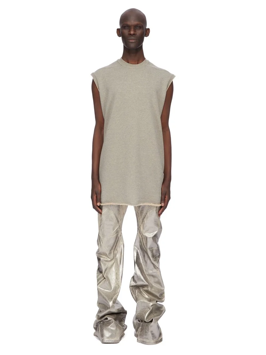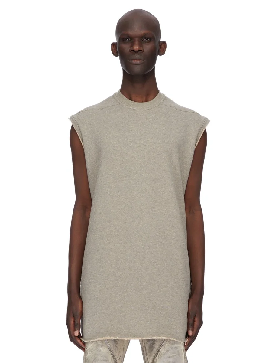 THIS TARP T IS BELOW HIP LENGTH, WITH A LOOSE FIT. IT IS SLEEVELESS WITH WIDE SHOULDERS AND A RIBBED CREW NECK. IT FEATURES SIGNATURE FRONT LEVEL SHOULDER SEAMS AND SINGLE SEAM RUNNING DOWN THE CENTRE BACK SPINE.