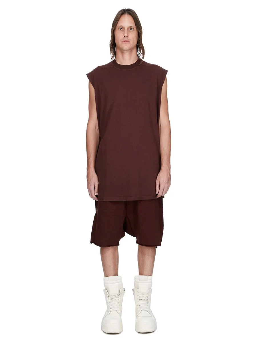 THIS TARP T IS BELOW HIP LENGTH, WITH A LOOSE FIT. IT IS SLEEVELESS WITH WIDE SHOULDERS AND A RIBBED CREW NECK. IT FEATURES SIGNATURE FRONT LEVEL SHOULDER SEAMS AND SINGLE SEAM RUNNING DOWN THE CENTRE BACK SPINE.