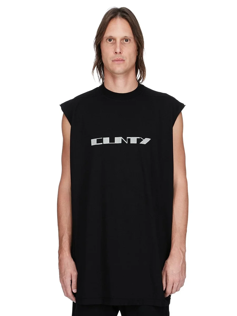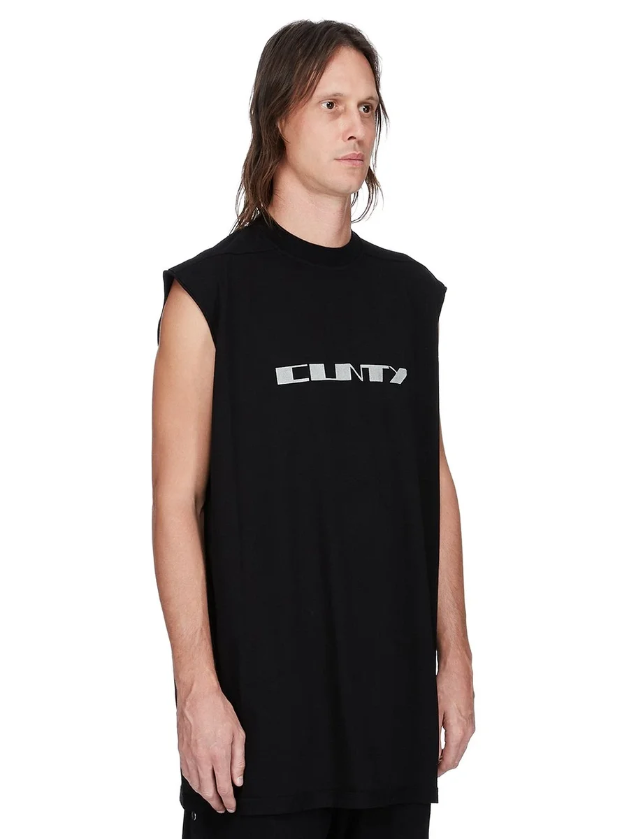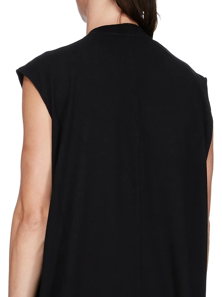 THIS TARP T IS BELOW HIP LENGTH, WITH A LOOSE FIT. IT IS SLEEVELESS WITH WIDE SHOULDERS AND A RIBBED CREW NECK. IT FEATURES SIGNATURE FRONT LEVEL SHOULDER SEAMS AND SINGLE SEAM RUNNING DOWN THE CENTRE BACK SPINE.