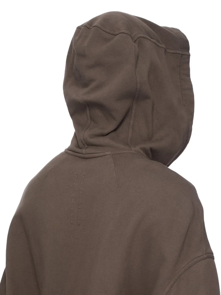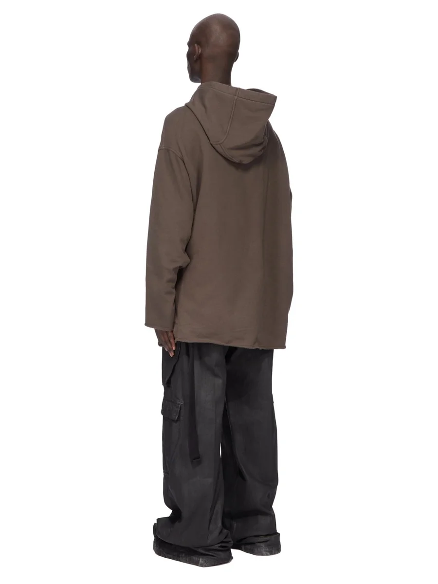 THIS PETER HOODIE IS HIP LENGTH, DIPPING SLIGHTLY AT THE BACK, WITH AN OVERSIZE FIT. IT HAS LONG SLEEVES WITH LOW SHOULDERS, A DROPPED ARMHOLE, A HOOD WITH DRAWSTRING AND RAW CUT HEMS. IT FEATURES A YOKE AND DIAGONAL SEAMS WITH TOPSTITCHING ON THE FRONT AND BACK BODY.