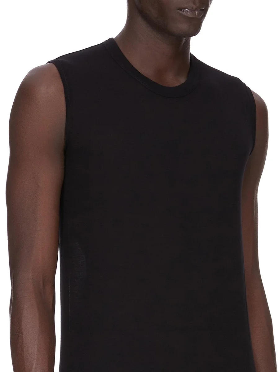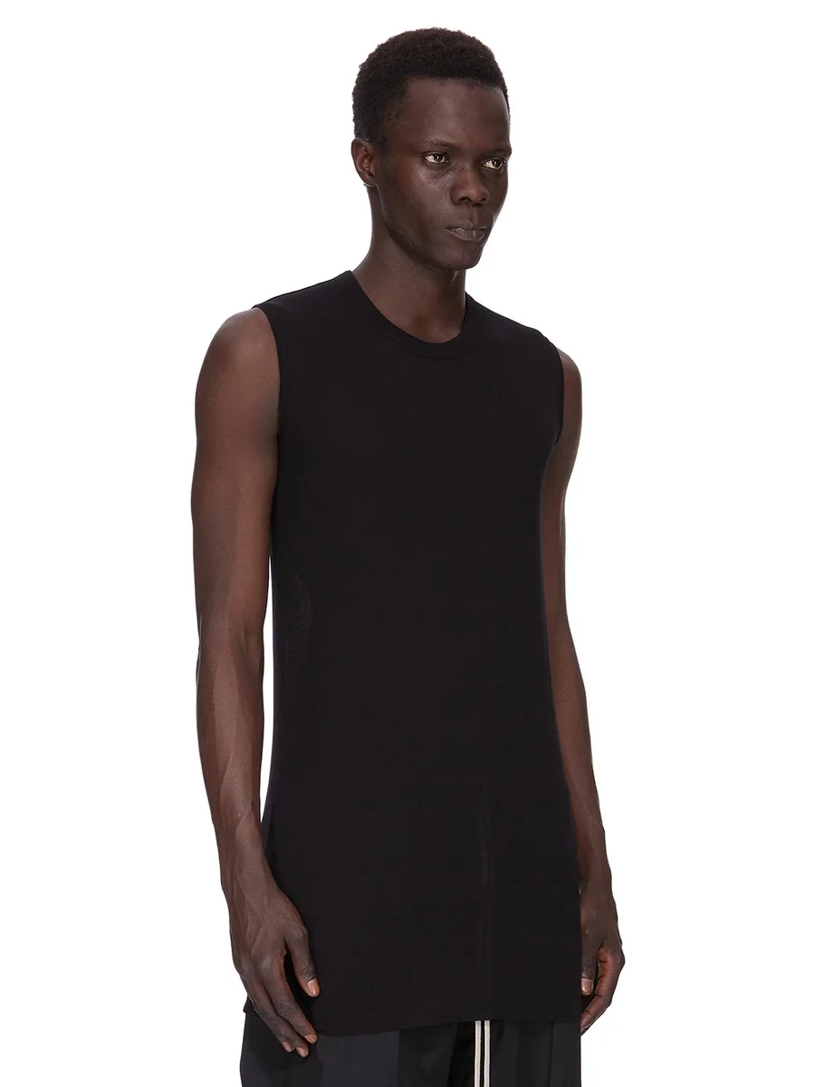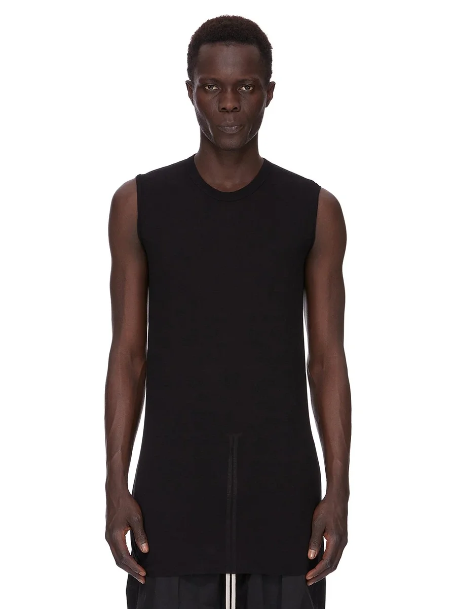 THIS BASIC SL T IS BELOW HIP LENGTH AND SLEEVELESS. IT HAS A RIBBED ROUND NECK, RAW CUT HEM AND REINFORCED RAW SHOULDERS. IT FEATURES THE SIGNATURE SINGLE SEAM RUNNING DOWN THE CENTRE BACK SPINE.