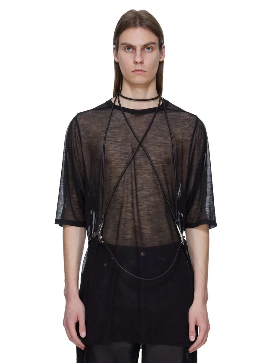 THIS CORD TANK IS MADE FROM SEVERAL CORDS GOING AROUND THE NECK AND CROSSING OVER THE CHEST AND AROUND THE WAIST. THEY ARE LINKED TOGETHER BY TWO SMALL CERBERUS KEYCHAINS THAT FEATURES A TRIPLE-SIDED SNAP HOOK, ENGRAVED WITH THE RICK OWENS LOGO.