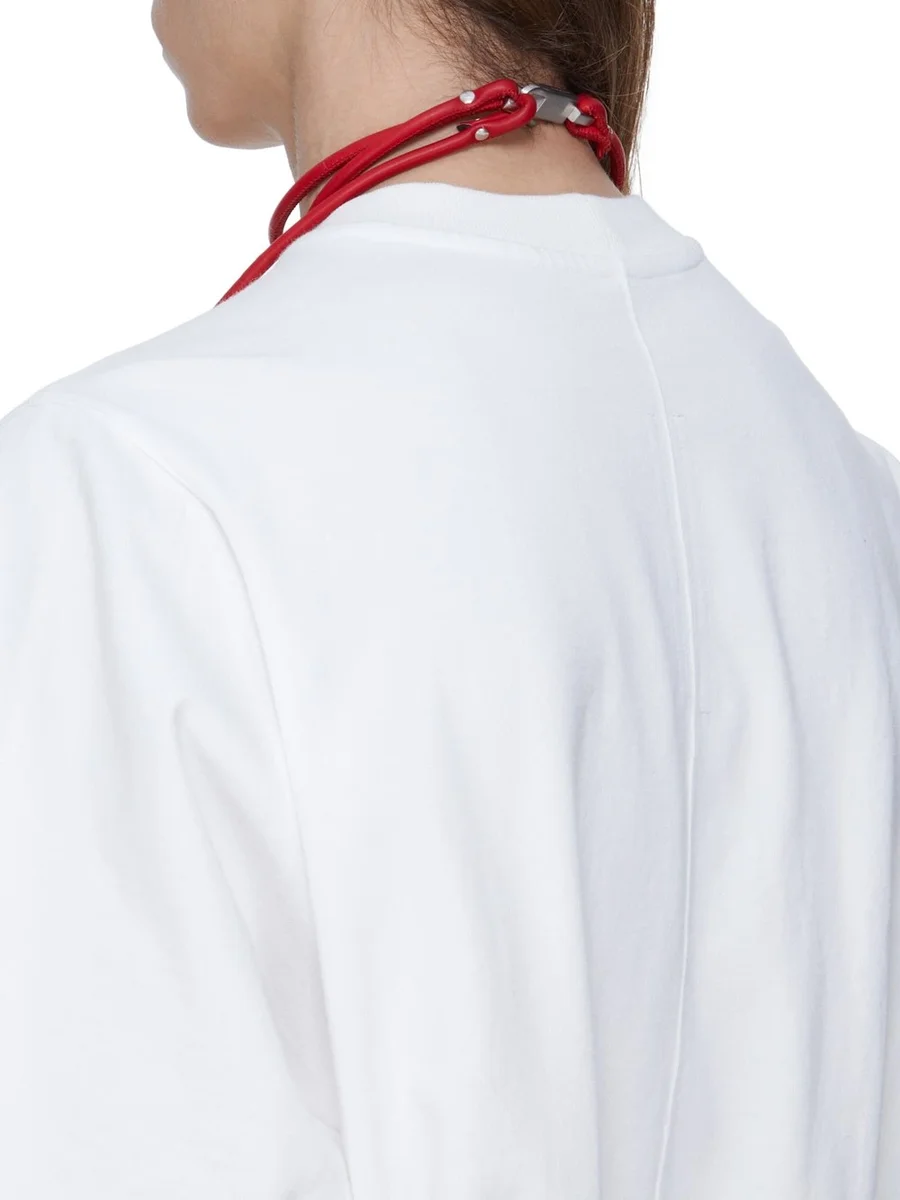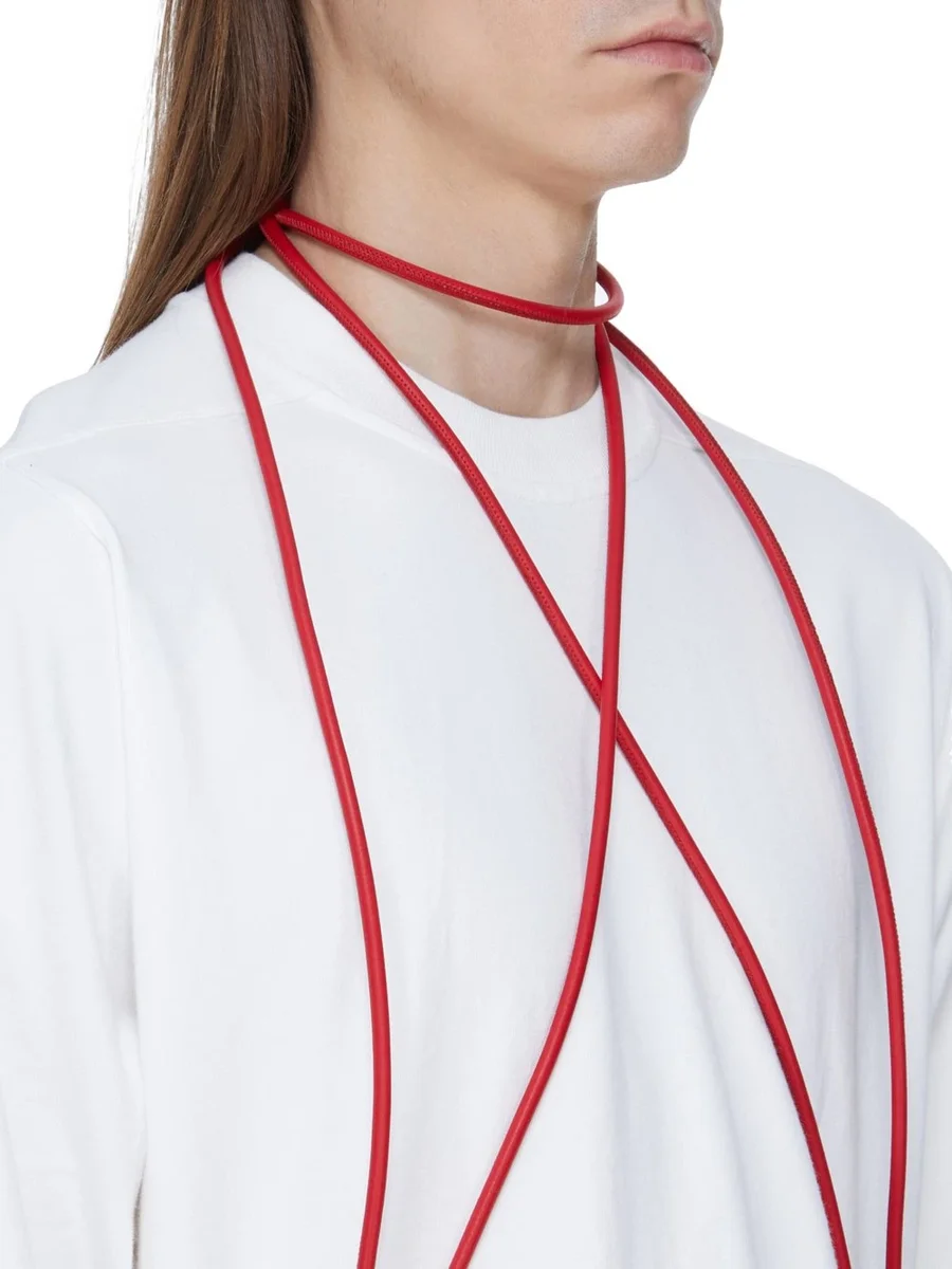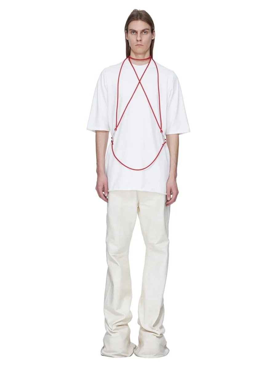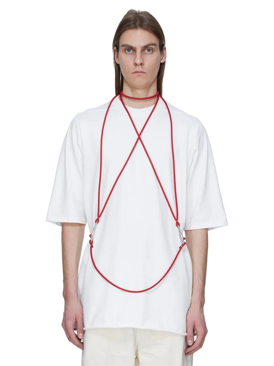 THIS CORD TANK IS MADE FROM SEVERAL CORDS GOING AROUND THE NECK AND CROSSING OVER THE CHEST AND AROUND THE WAIST. THEY ARE LINKED TOGETHER BY TWO SMALL CERBERUS KEYCHAINS THAT FEATURES A TRIPLE-SIDED SNAP HOOK, ENGRAVED WITH THE RICK OWENS LOGO.