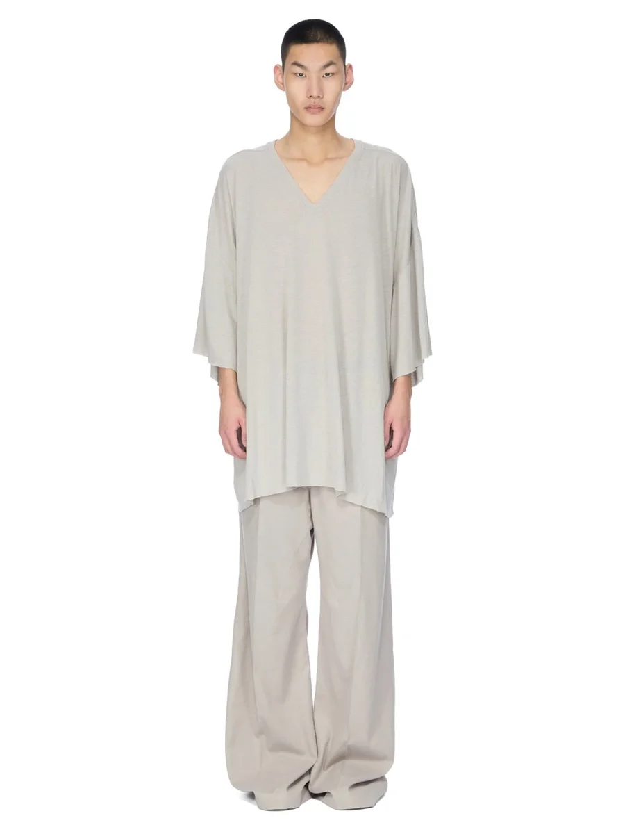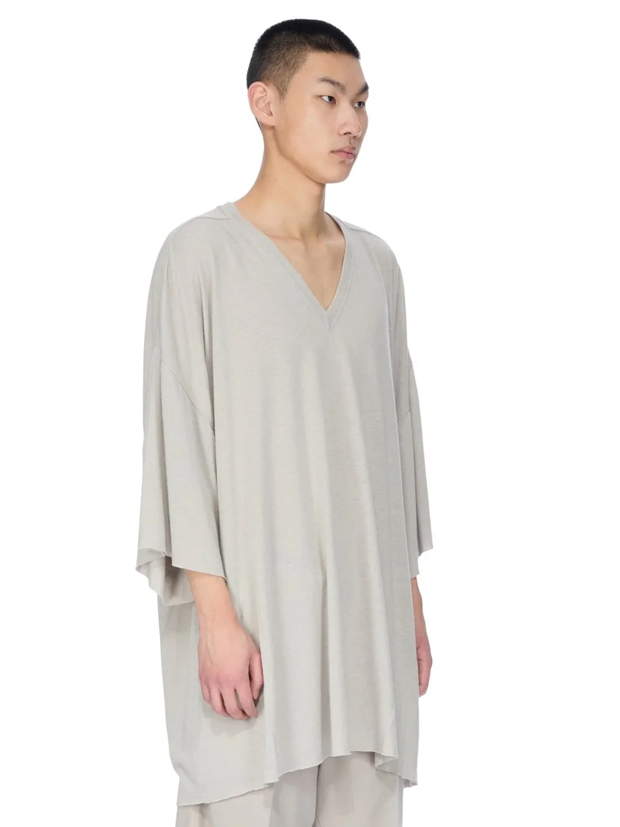 THIS V TOMMY T IS BELOW HIP LENGTH WITH A JUMBO OVERSIZED FIT. IT HAS WIDE SHORT SLEEVES WITH A DROPPED ARMHOLE, RAW CUT HEMS AND A V NECK. IT FEATURES SIGNATURE FRONT LEVEL SHOULDER SEAMS.