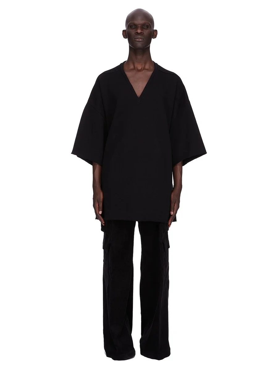 THIS V TOMMY T IS BELOW HIP LENGTH WITH A JUMBO OVERSIZED FIT. IT HAS WIDE SHORT SLEEVES WITH A DROPPED ARMHOLE, RAW CUT HEMS AND A V NECK. IT FEATURES SIGNATURE FRONT LEVEL SHOULDER SEAMS.