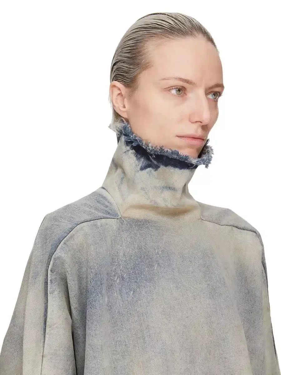 THIS JUMBO TABARD IS BELOW HIP LENGTH WITH A JUMBO BOXY FIT. IT HAS LONG SLEEVES, AND LOW SHOULDER SEAMS. IT FEATURES A HIGH COLLAR WITH A CENTRE BACK OPENING WITH SNAP CLOSURES AND A RAW CUT HEM, NECK AND SLEEVES.