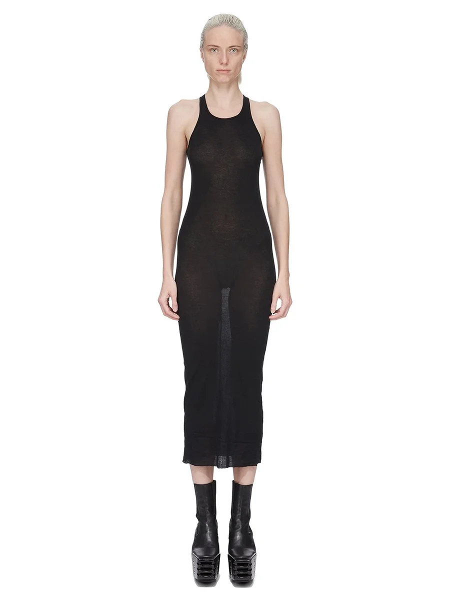 RICK OWENS FOREVER TANK DRESS IN BLACK MINI RIB JERSEY.
