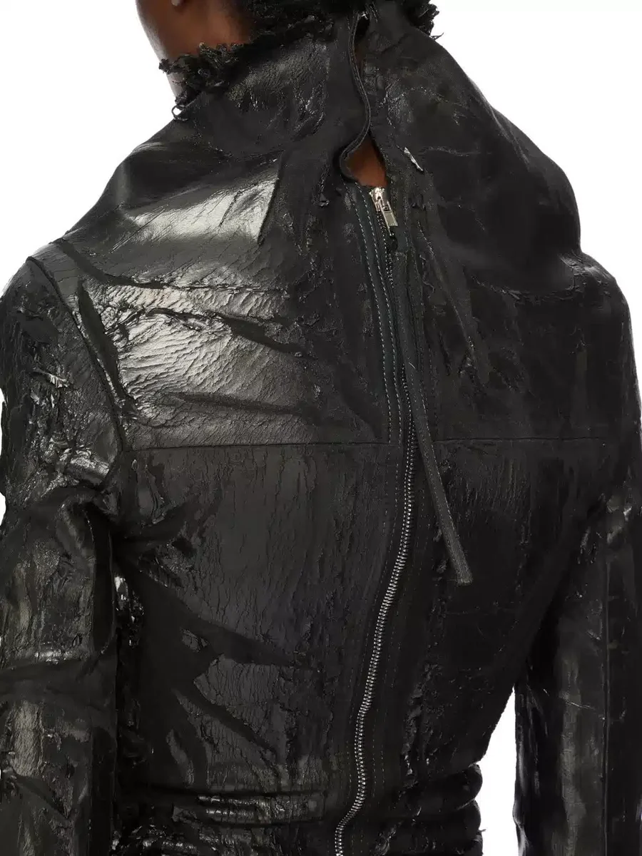 THIS LIGHTWEIGHT STRETCH MEGACRUST DENIM IS GARMENT DYED BLACK AND TREATED WITH A WAX FINISH, THEN SEVERAL LAYERS OF BLACK FOIL IS PRESSED ON TOP AND A FINAL WASH MAKES THE FOIL PEEL AND CRACK.