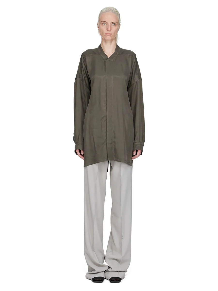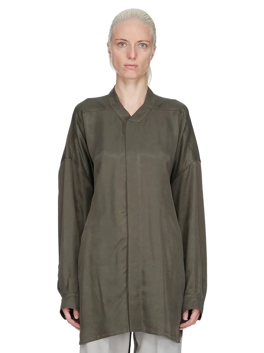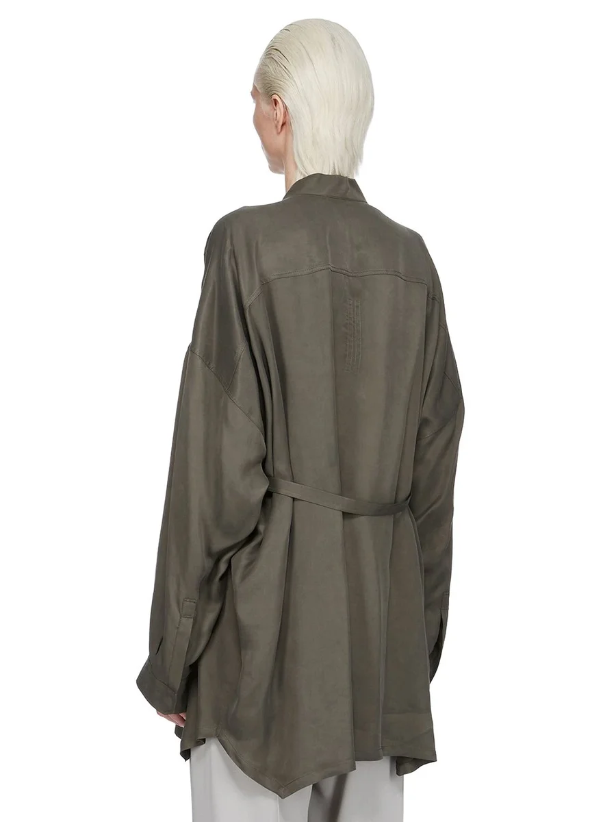 THIS JUMBO FAUN MINI IS BELOW-HIP LENGTH WITH LONG SLEEVES AND AN OVERSIZED. IT HAS A CENTRE FRONT OPENING WITH CONCEALED SNAP CLOSURES, A SLIGHT V NECK WITH FLAT COLLAR, AND SNAP CUFFS. IT FEATURES LEVEL SHOULDER SEAMS, BACK YOKE AND A HEMLINE WITH BEVELED SIDES.