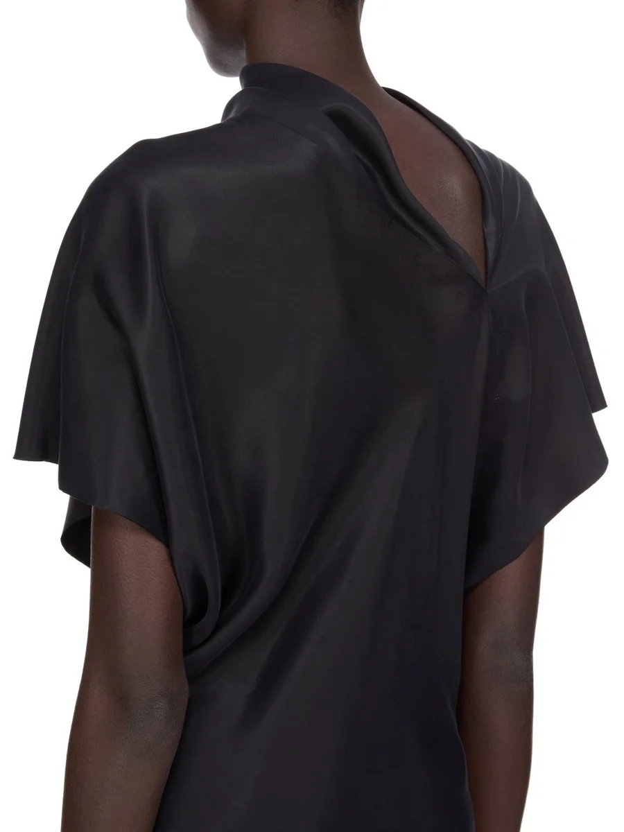 THIS SEB DRESS IS KNEE-LENGTH, WITH A DRAPED BIAS CUT BODY, SHORT WIDE KIMONO SLEEVES AND A HIGH DRAPED COWL NECK THAT HAS AN ASYMMETRICAL OPENING AT BACK.