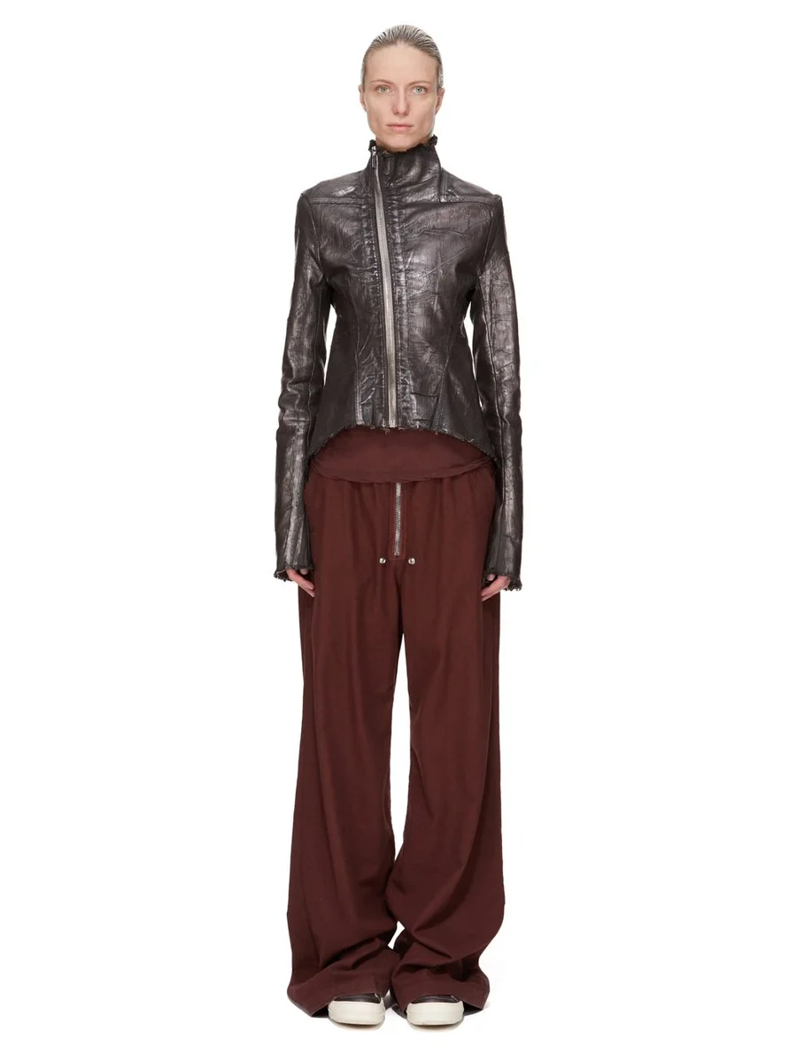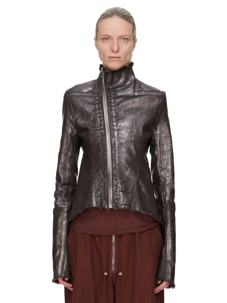 THIS NASKA GARY JACKET IS BELOW WAIST LENGTH WITH A SKIN TIGHT FIT. IT HAS LONG SLEEVES, A HIGH NECK WITH AN ASYMMETRICAL ZIP FRONT OPENING AND LEVEL SHOULDER SEAMS WITH TOPSTITCHING. IT FEATURES A CURVED NASKA HEMLINE THAT DIPS INTO TWO POINTS AT THE BACK AND HAS RAW CUT HEMS AND EDGES.