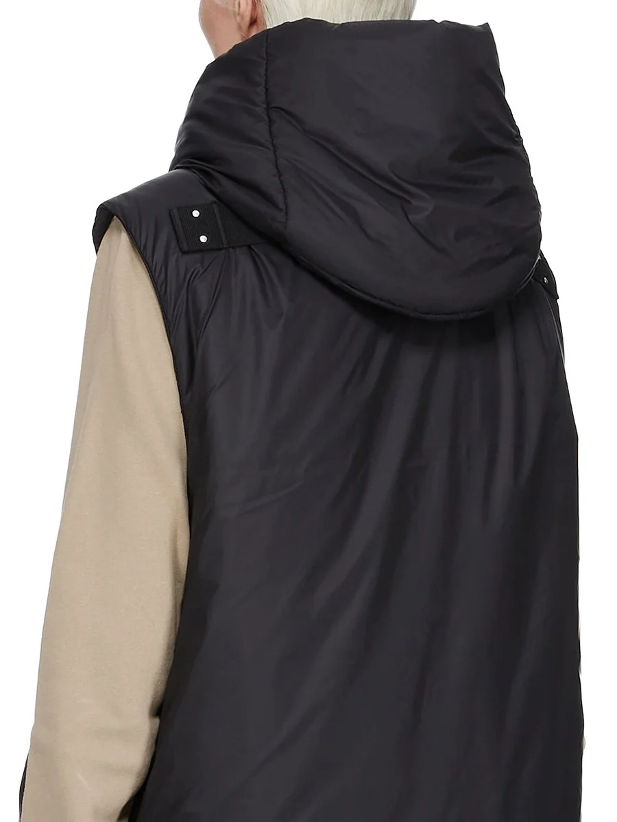 THIS HOODED LINER IS BELOW KNEE LENGTH AND SLEEVELESS. IT FEATURES OFF-CENTER FRONT CONCEALED SNAP CLOSURES, A HOOD, SIDE WELT POCKETS AND A COTTON WEBBING STRAP WITH RIVET DETAIL ACROSS THE BACK. IT IS FULLY LINED WITH INTERNAL QUILTING AND TWO SNAP POCKETS.
