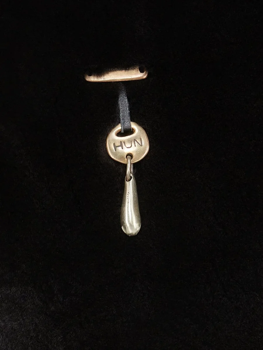 IT FEATURES A BELOW-THE-WAIST LENGTH, A DARKDUST GREY MINK FUR LINING, A WRAP FRONT, A BIG DRAWSTRING HOOD, TIGHT LONG SLEEVES, STRAP DETAILS ON THE SIDES THAT CAN KNOT IN THE FRONT, AND AN ASYMMETRIC HEMLINE THAT IS SHORTER ON THE SIDES.