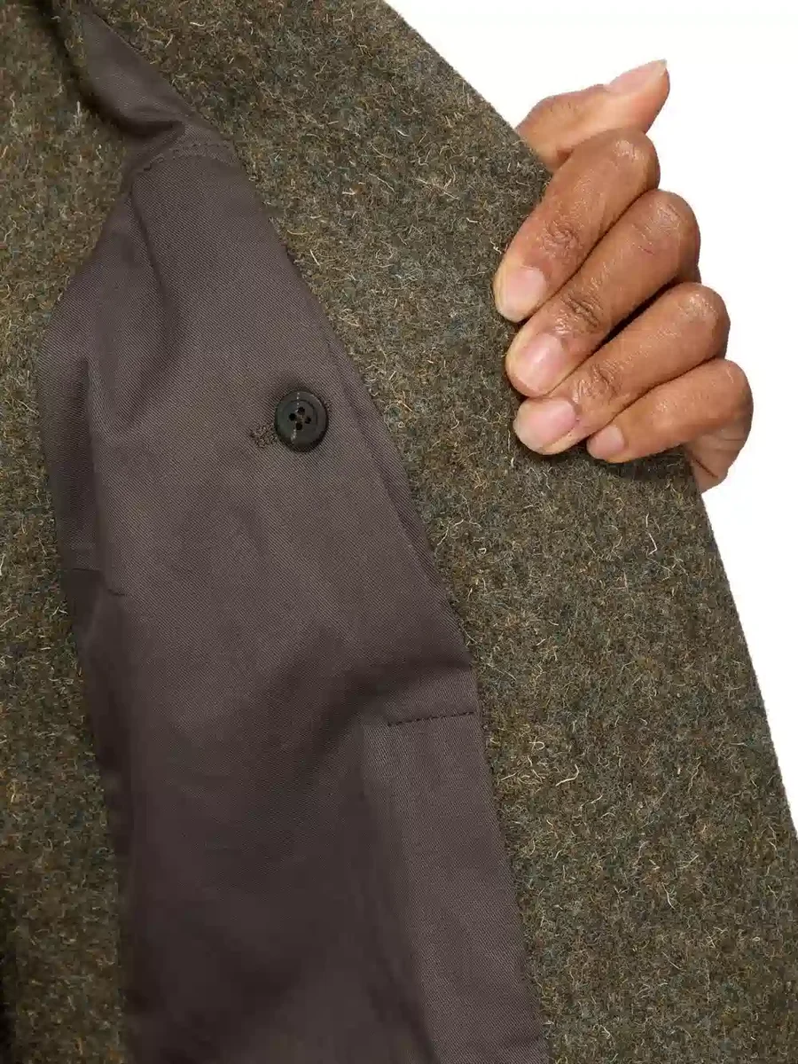 IT IS MADE FROM BRITISH WOOL BLENDED WITH KEMP, ALSO KNOWN AS DEAD HAIR. KEMP FIBERS ARE NATURAL TO SOME SHEEP BREEDS AND DO NOT TAKE DYE.