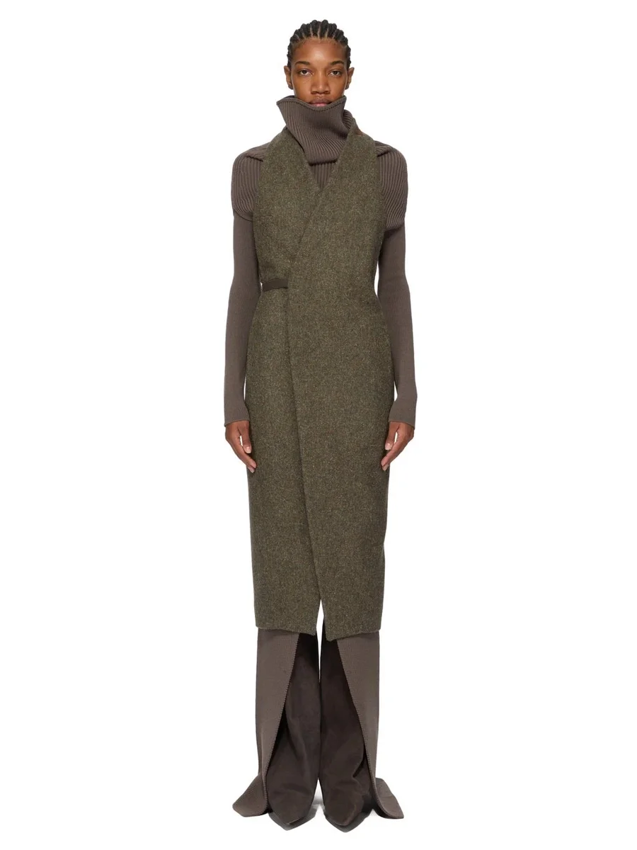 THIS SL CYCLOPS COAT IS BELOW KNEE LENGTH AND SLEEVELESS. IT HAS A DEEP ARMHOLES AND A WRAP FRONT THAT SECURES WITH A WRAP-AROUND BELT, IN FRONT OR BACK THAT CREATES BACK DRAPING. IT HAS A BACK VENT AND INTERNAL BUTTONED POCKETS.