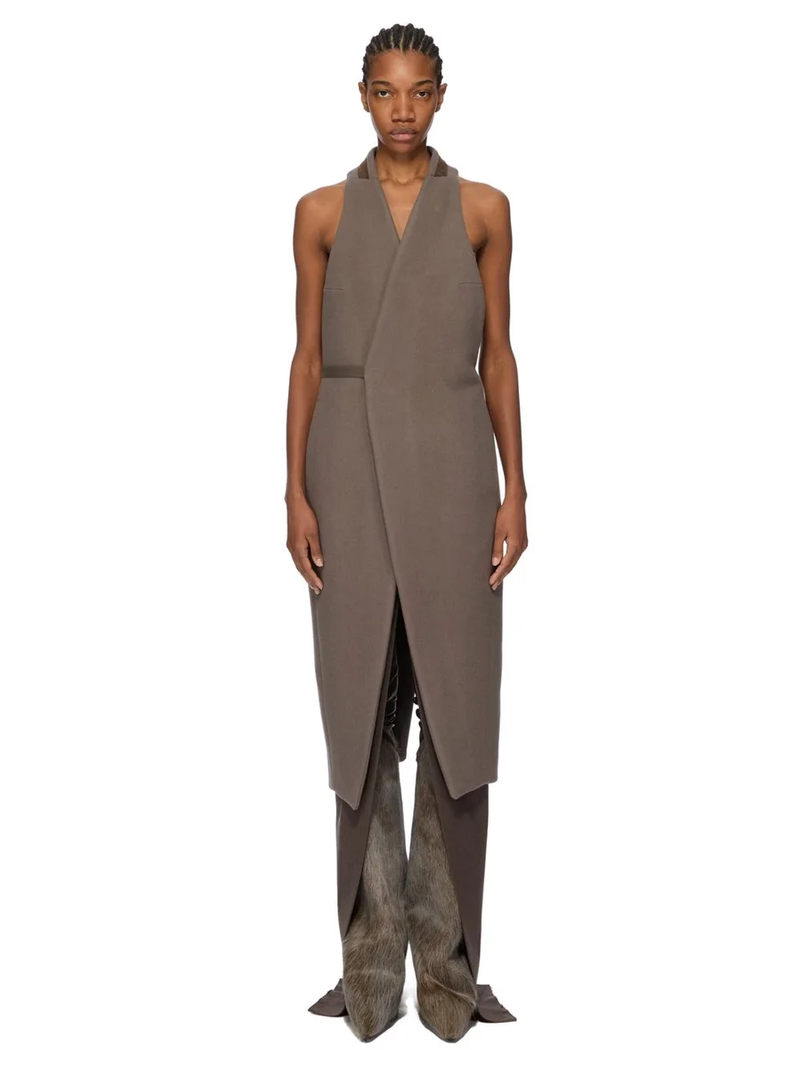 THIS SL CYCLOPS COAT IS BELOW KNEE LENGTH AND SLEEVELESS. IT HAS A DEEP ARMHOLES AND A WRAP FRONT THAT SECURES WITH A WRAP-AROUND BELT, IN FRONT OR BACK THAT CREATES BACK DRAPING. IT FEATURES AN EXTENDED LENGTH COLLAR THAT CAN BE WORN UP OR DOWN AND HOLDS ITS SHAPE THANKS TO IT BEING REINFORCED WITH FUSING MATERIAL. IT HAS A BACK VENT AND SIDE SEAM POCKETS. IT IS FULLY LINED.