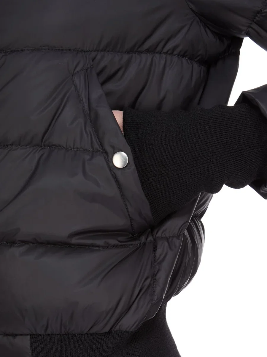 THIS DUVET FLIGHT IS HIP LENGTH WITH LONG SLEEVES. IT HAS A CENTRE FRONT ZIPPER WITH TOP SNAP AND A RIBBED COLLAR, CUFFS AND WAISTBAND. IT FEATURES ROUNDED SHOULDERS AND HORIZONTAL STITCHING LINES.