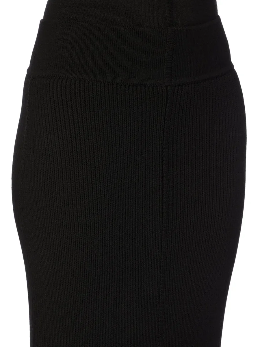 THIS SLICED SKIRT IS ANKLE LENGTH AT SIDES. IT HAS AN ELASTICIZED WAISTBAND AND A CLOSE TO THE BODY FIT. IT FEATURES TWO HIGH SLITS FRONT AND BACK.