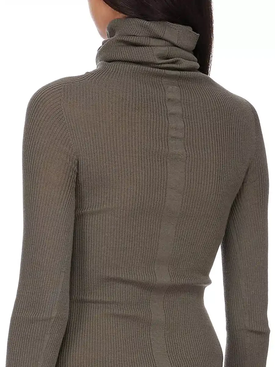 THIS LS TUBE IS BELOW HIP LENGTH AND HAS A CLOSE TO THE BODY FIT. IT IS A FULLY FASHIONED RIBBED KNIT WITH LONG SLEEVES AND A HIGH DRAPED FUNNEL NECK. IT HAS A SIGNATURE KNIT LINE RUNNING DOWN THE CENTRE BACK SPINE.