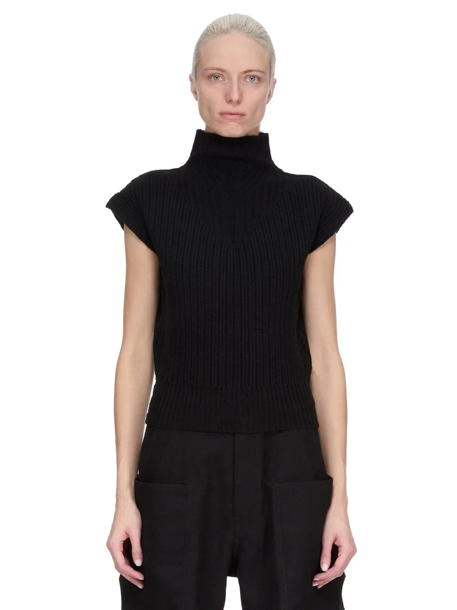 THIS SL TURTLE IS ABOVE HIP LENGTH, IT HAS WIDE SHOULDERS AND IS SLEEVELESS. IT HAS A TURTLE NECK AND WIDE WAISTBAND IN SLIM RIBBING. IT FEATURES A MEGARIB KNIT DESIGN, WITH A WIDE VERTICAL RIB THE BACK AND FRONT BODY, AND DIAGONAL LINES RUNNING DOWNWARDS INTO THE CENTRE FRONT. IT HAS A VERTICAL RIB BACK WITH THE SIGNATURE KNIT CHANNEL RUNNING DOWN THE CENTRE BACK SPINE.