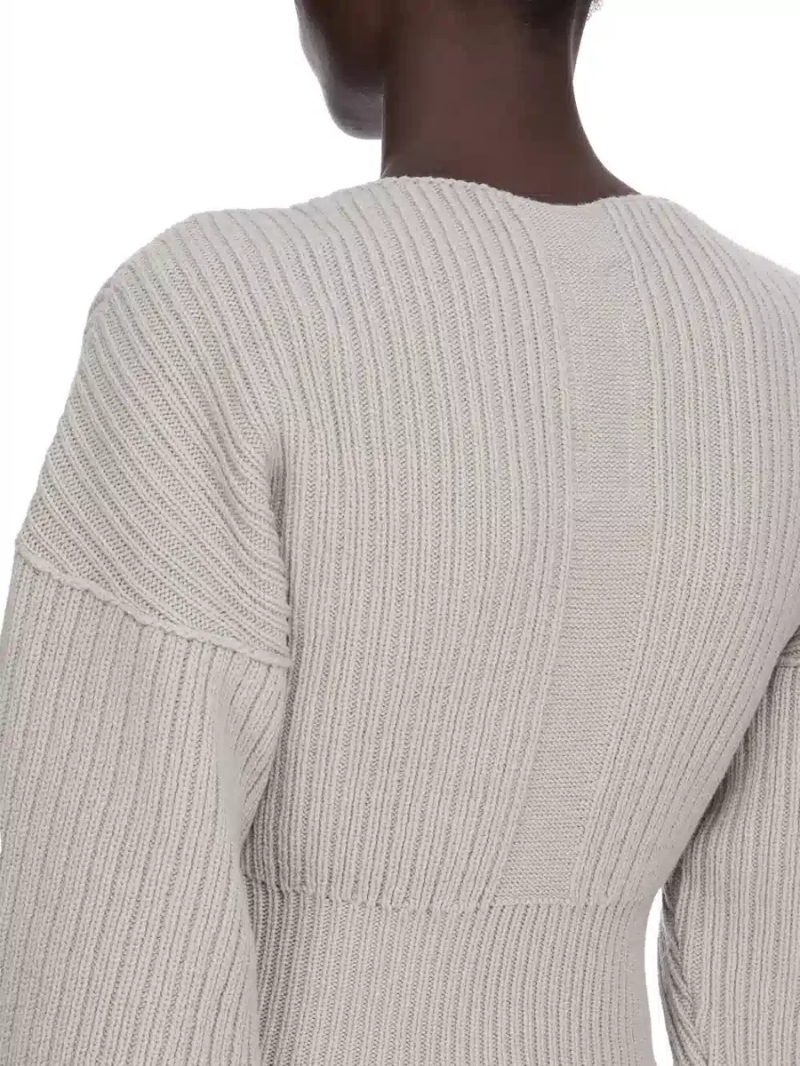 THIS DAFNE IS BELOW HIP LENGTH WITH LONG SLEEVES. IT HAS A ROUNDED FIT WHICH CINCHES INTO THE WAIST WITH A WIDE RIB JACQUARD, A RAISED BOAT NECK, WIDE SHOULDERS AND LOOSE SLEEVES THAT NARROW TO SLIM CUFFS. IT FEATURES A MEGARIB KNIT DESIGN, WITH A WIDE VERTICAL RIB THE BACK AND FRONT BODY, AND DIAGONAL LINES RUNNING DOWNWARDS INTO THE CENTRE FRONT. IT HAS A VERTICAL RIB BACK WITH THE SIGNATURE KNIT CHANNEL RUNNING DOWN THE CENTRE BACK SPINE.