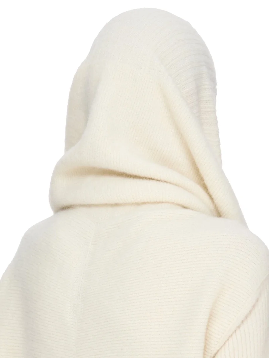THIS LONG CARDIGAN IS ANKLE LENGTH WITH LONG SLEEVES AND AN AMPLE FIT. IT HAS AN OPEN FRONT WITH A WIDE RIBBED SHAWL COLLAR THAT CAN BE WORN, HOOD-LIKE, UP OVER THE HEAD. IT FEATURES A WIDE KNIT SHOULDER LINE, AND SIDE FRONT POCKETS. IT HAS WIDE RIBBING LINES DESCENDING FROM THE UPPER ARM TO THE WRIST AND A SIGNATURE KNIT CHANNEL RUNNING DOWN THE CENTRE BACK SPINE.
