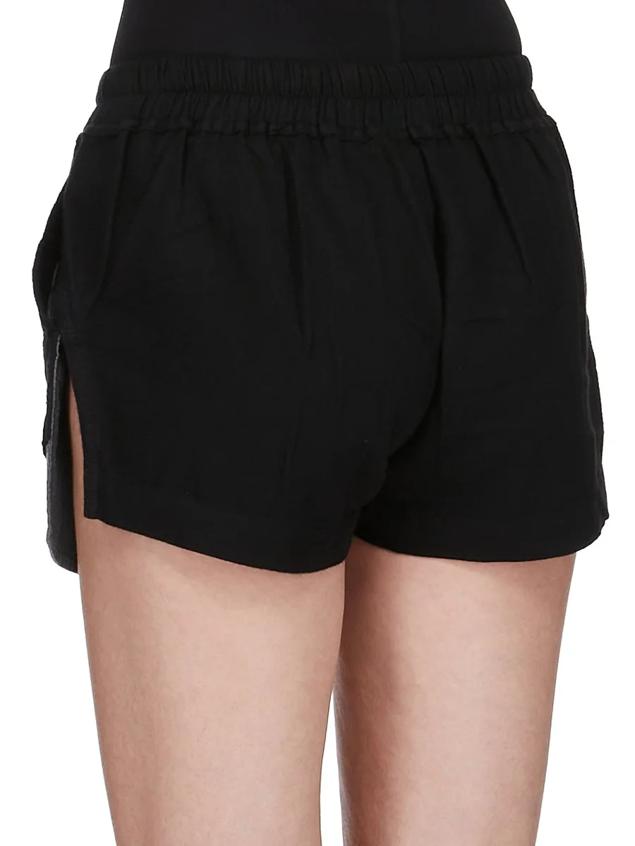 THESE FOG BOXERS ARE CUT HIGH ON THE THIGH. THEY HAVE AN ELASTICIZED WAISTBAND WITH DRAWSTRING, SIDE WELT POCKETS AND SIDE SLITS.