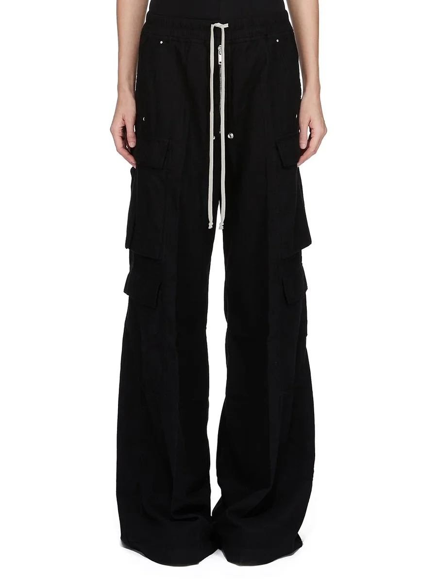 THESE DOUBLE CARGO JUMBO BELA PANTS ARE FULL-LENGTH WITH A LOW CROTCH AND WIDE LEG. THEY FEATURE AN ELASTICIZED WAISTBAND WITH DRAWSTRING AND A BELA EXPOSED CENTER ZIPPER WITH TWO SNAP DETAIL, AND SIDE WELT POCKETS WITH RIVETS. THEY FEATURE TWO BEVELED CARGO POCKETS ON THE THIGH, WITH TWO SQUARE CARGO POCKETS BELOW AND TWO SQUARE BACK POCKETS. THEY ALL HAVE FLAPS AND TOPSTITCHING.