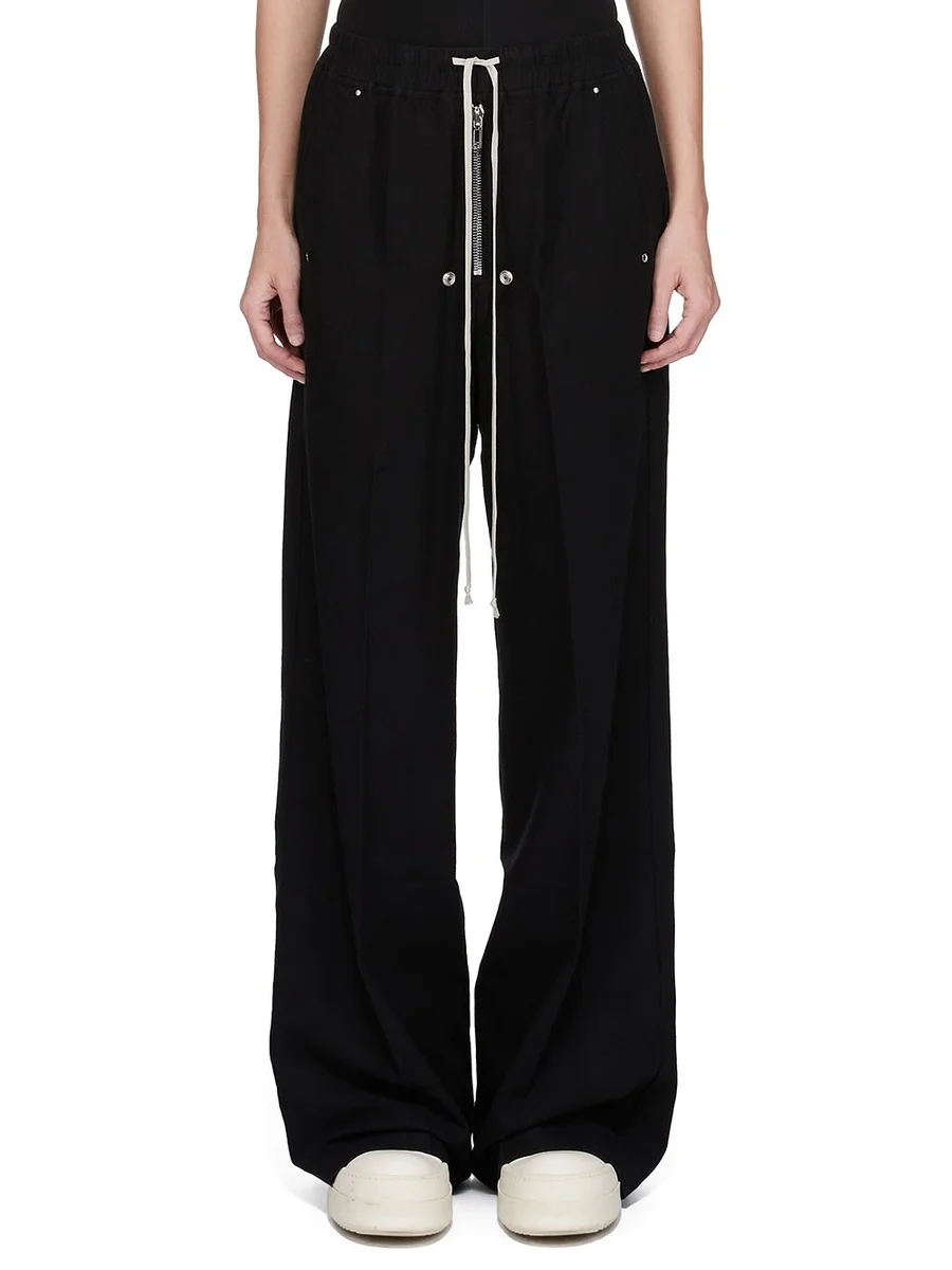 THESE GETH BELA PANTS ARE FULL-LENGTH WITH A LOW CROTCH AND WIDE LEG. THEY FEATURE AN ELASTICIZED WAISTBAND WITH VERTICAL STITCHING AND DRAWSTRING AND A BELA EXPOSED CENTER ZIPPER WITH TWO SNAP DETAIL AT BOTTOM. THEY HAVE SIDE POCKETS WITH EYELET AND RIVET DETAIL AND BACK POCKETS WITH FLAPS AND VISIBLE SNAP CLOSURES.