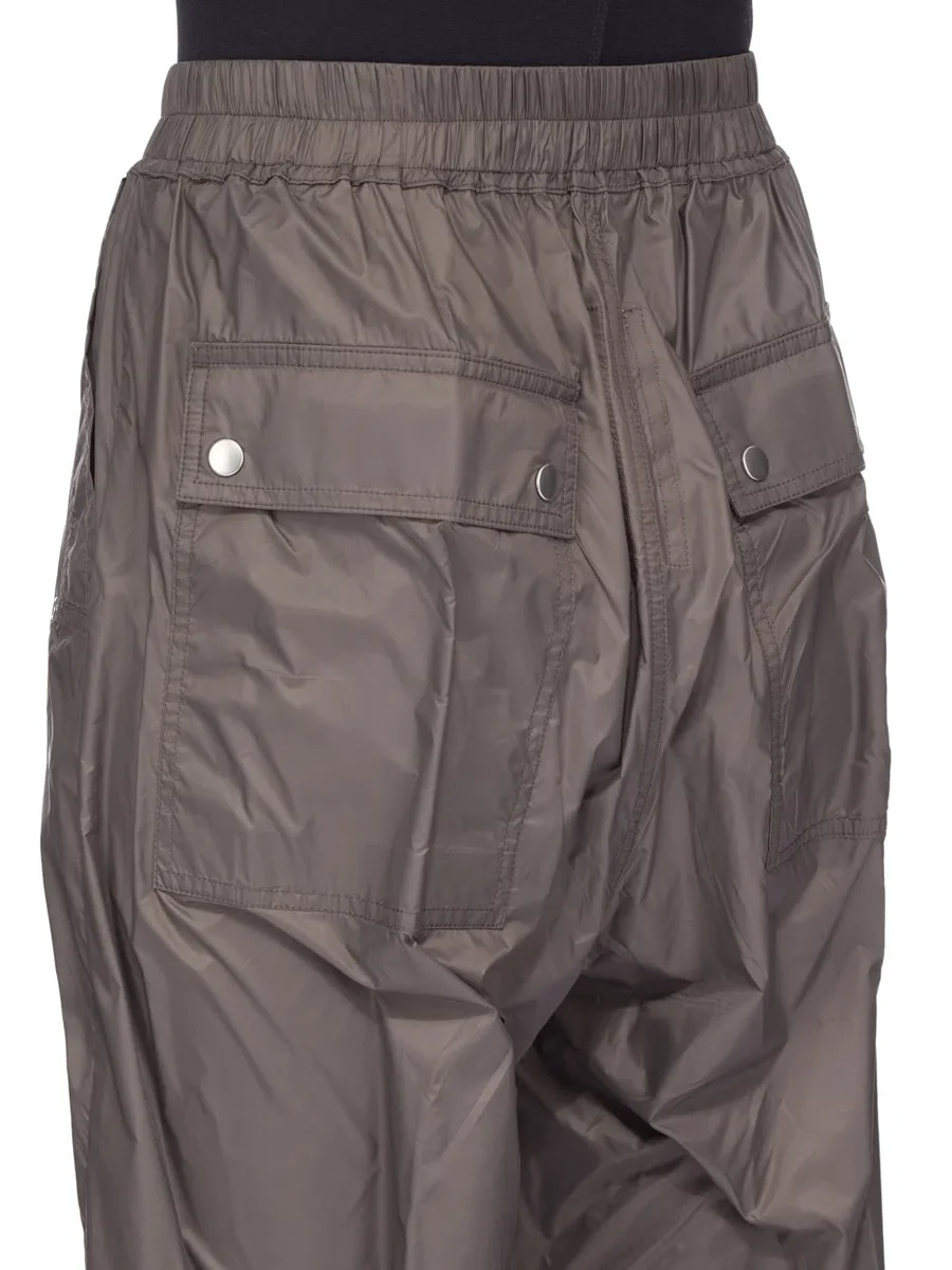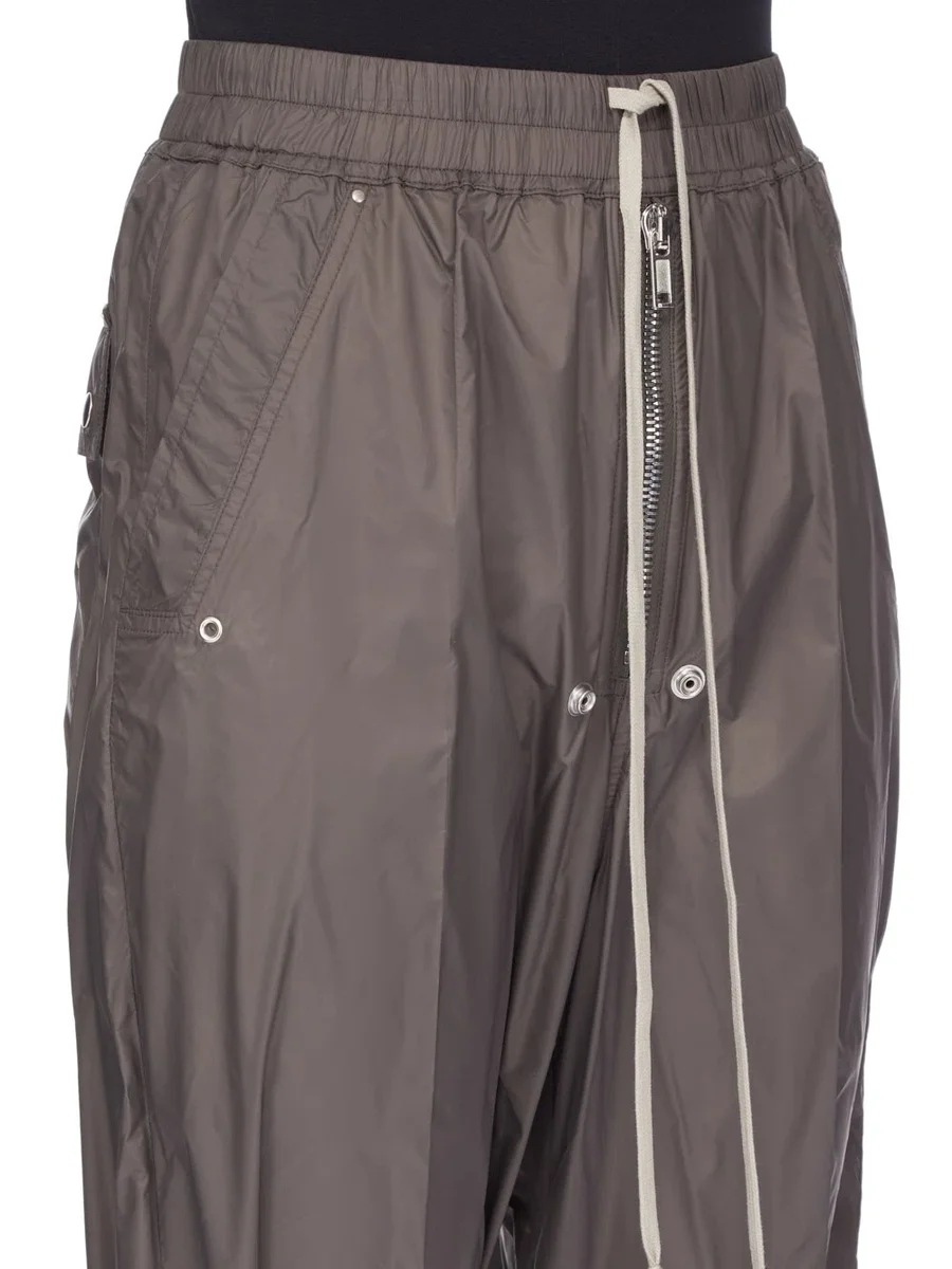 THESE GETH BELA PANTS ARE FULL-LENGTH WITH A LOW CROTCH AND WIDE LEG. THEY FEATURE AN ELASTICIZED WAISTBAND WITH VERTICAL STITCHING AND DRAWSTRING AND A BELA EXPOSED CENTER ZIPPER WITH TWO SNAP DETAIL AT BOTTOM. THEY HAVE SIDE POCKETS WITH EYELET AND RIVET DETAIL AND BACK POCKETS WITH FLAPS AND VISIBLE SNAP CLOSURES.