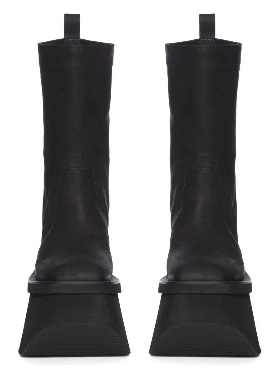 THESE FACTORY BOOTS ARE MID-CALF HEIGHT. THEY HAVE A TOPSTITCHED SEAM ARCING OVER THE FRONT FOOT WITH STITCHING RUNNING OVER THE ANTERIOR ANKLE. THEY FEATURE AN ANGULAR HEEL COUNTER AND A BACK LOOP PULL TAB AND HAVE 14CM HIGH SHARK-TOOTH SOLE UNDERNEATH AND AT FRONT AND HAVE A SLANTING HEEL AND INCLINED TOE PLATFORM.
