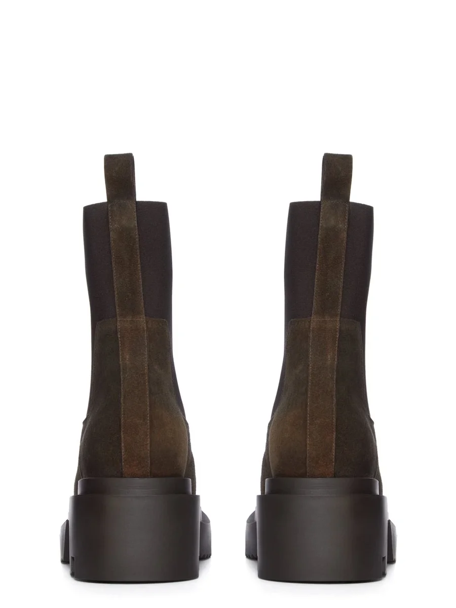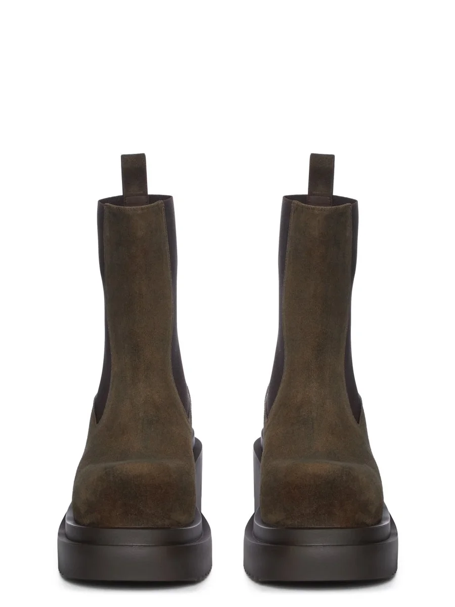 THESE BEATLE BOGUN BOOTS ARE ABOVE-ANKLE HEIGHT. THEY HAVE GEOMETRIC SIDE PANELS IN STRETCH ELASTIC, AN ANGULAR HEEL COUNTER WITH TOP STITCHING AND A BACK LOOP PULL TAB. THEY HAVE A ROUNDED TOE AND FEATURE A BOGUN RUBBER MEGA CREEPER SOLE WITH A TOOTHED SQUARE HEEL.
