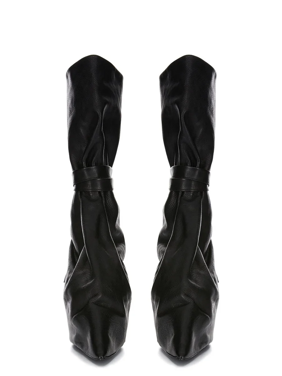 THESE TIED TACO KISS ARE A SHORTER, DEFLATED, VERSION OF OUR STRAYTUKAY COLLABORATION BOOTS. THEY ARE ABOVE ANKLE HEIGHT. THEY FEATURE A LEATHER UPPER THAT FLARES DOWN FROM ABOVE ANKLE AND IS TIED WITH LEATHER STRAPS AROUND THE ANKLE, CREATING A SLIGHT DRAPE. IT THEN CURVES INTO THE BACK HEEL AND POINTS AT THE TOE. INSIDE THEY HAVE A 12CM CONCEALED WEDGE (4,5CM RISE) AND A THICK FRONT PLATFORM (7,5CM).