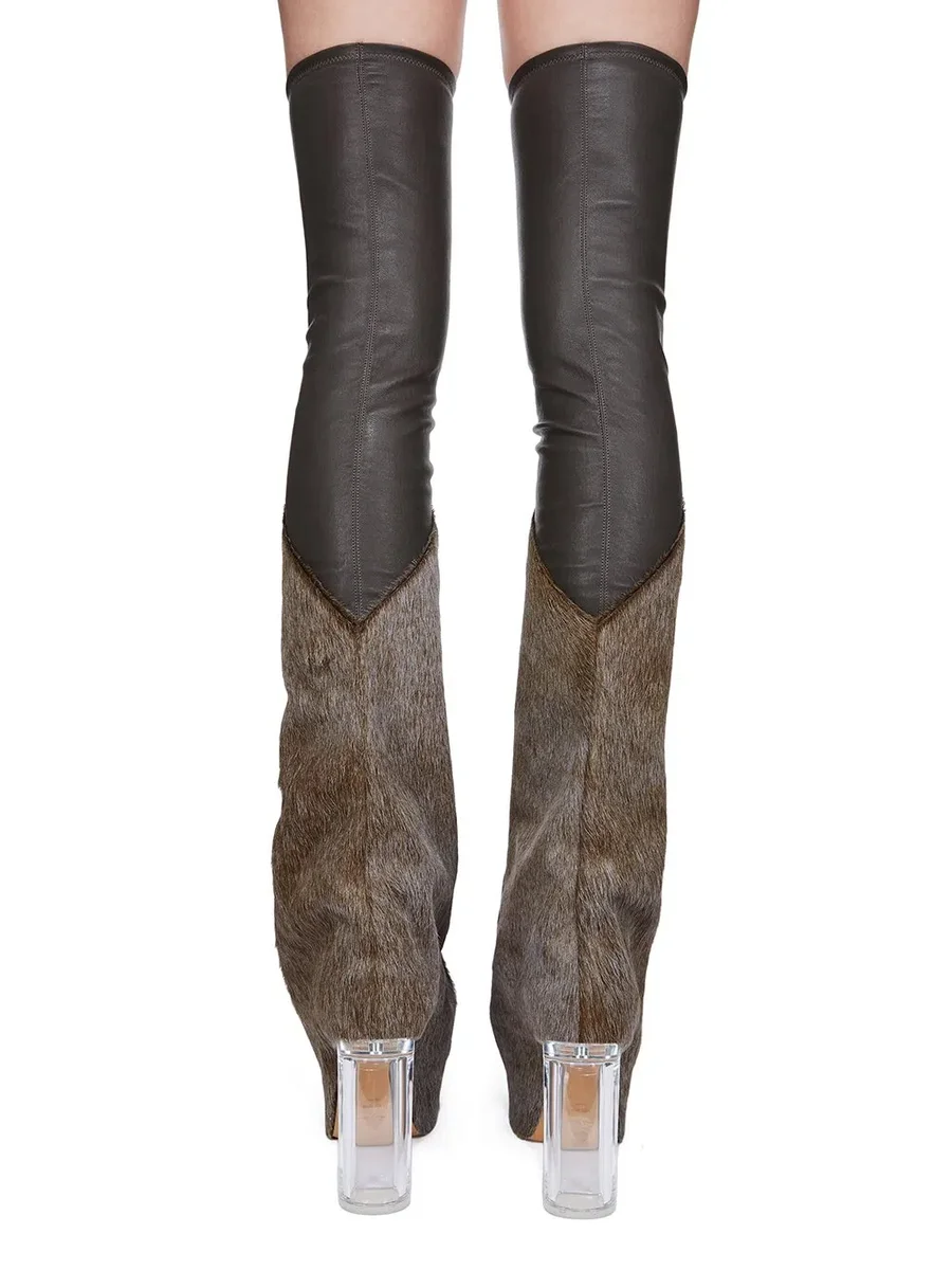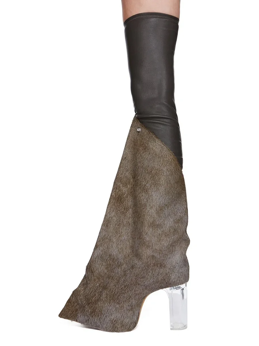 THESE TACO KISS BOOTS ARE A DEFLATED VERSION OF OUR STRAYTUKAY COLLABORATION BOOTS. THEY ARE THIGH HIGH. THEY HAVE A TIGHT SOCK UPPER, JOINING TO A DIAGONAL SEAM LINE THAT SLOPES FROM MIDPOINT, OVER THE KNEE, DOWN TO THE CENTRE BACK CALF. THEY FEATURE A LEATHER UPPER THAT FLARES DOWN THE LOWER LEG, CURVING INTO THE BACK HEEL AND POINTING AT THE TOE. THEY HAVE A 12CM TRANSPARENT HEEL (4,5CM RISE) AND A THICK FRONT PLATFORM.