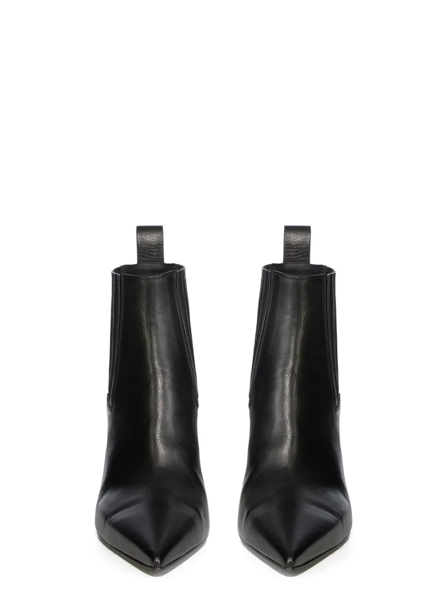 THESE ANKLE SHARP ARE JUST UNDER ANKLE HEIGHT. THEY FEATURE A LEATHER UPPER SLANTS SHARPLY INTO A FRONT POINT AT THE TOE. THEY FEATURE AN 8CM CANTILEVER HEEL, ELASTICIZED SIDE PANELS AND A BACK PULL TAB.