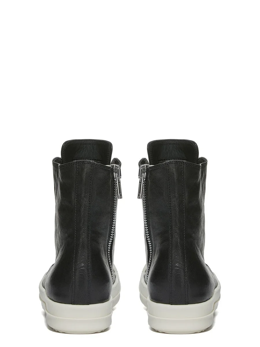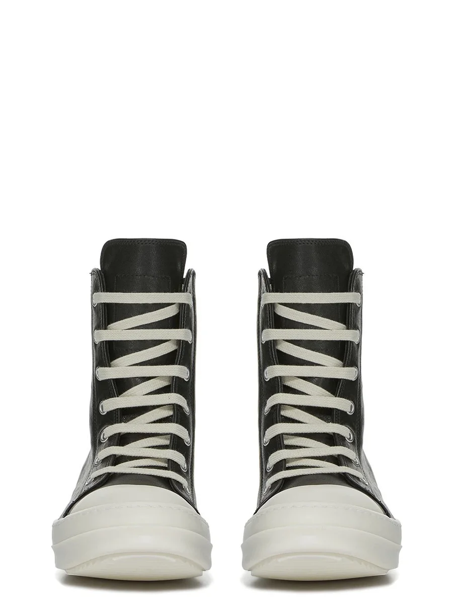 THESE SNEAKERS ARE ABOVE-ANKLE HEIGHT AND FEATURE SEVEN EYELETS, LACES, A ZIPPER ON THE INSIDE ANKLE FOR EASY FASTENING, TOE CAPS AND SHARK-TOOTHED BUMPER SOLES.