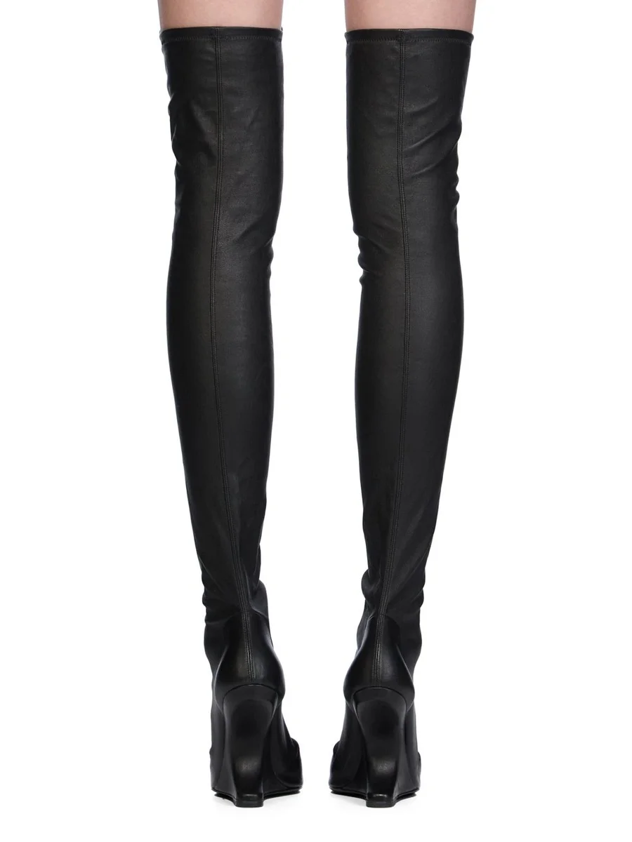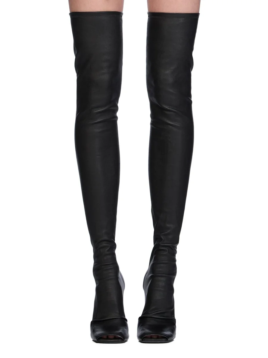 THIS CANTILEVER 11 BOOT IS A HIGH CANTILEVERED HEEL BOOT WITH A TIGHT STRETCH, THIGH HIGH SOCK AND A SQUARE, SLIGHTLY OPEN TOE.