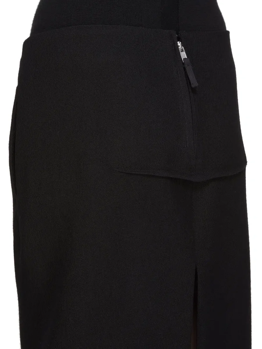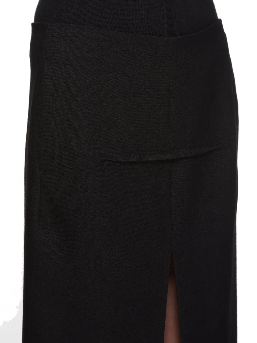 THIS SLICED SKIRT IS FLOOR LENGTH AT SIDES. IT HAS A CENTRE BACK ZIPPER AND A CLOSE TO THE BODY FIT. IT FEATURES TWO HIGH SLITS FRONT AND BACK AS WELL AS A FRONT AND BACK STITCH RIDGE DETAIL. IT HAS SIDE SEAM POCKETS.