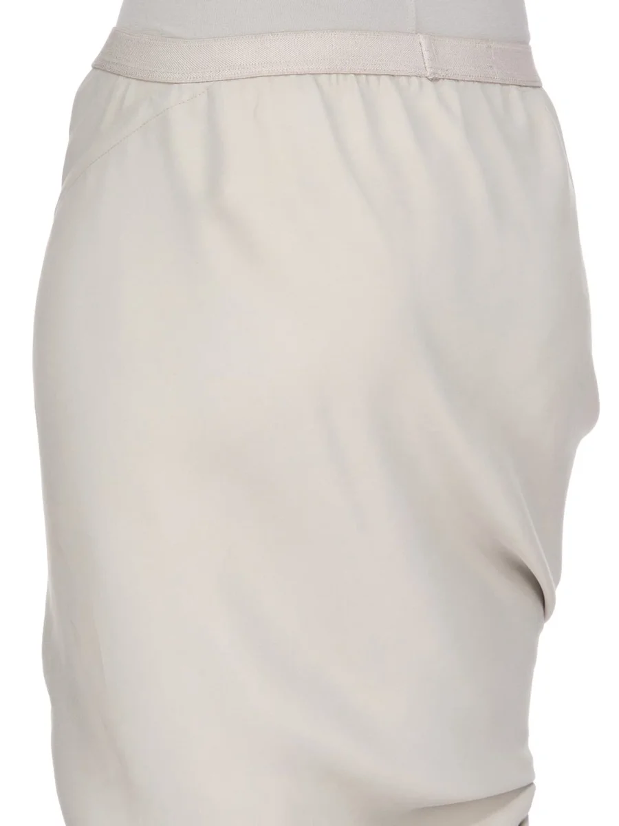 THIS SEB SKIRT IS BELOW-KNEE LENGTH AT FRONT AND KNEE LENGTH AT BACK. IT HAS AN ELASTICIZED WAISTBAND. IT GATHERS IN THE FRONT, AND HAS A DRAPED BIAS CUT FROM WHICH SLIGHT FOLDS FALL TO THE FRONT HEM.