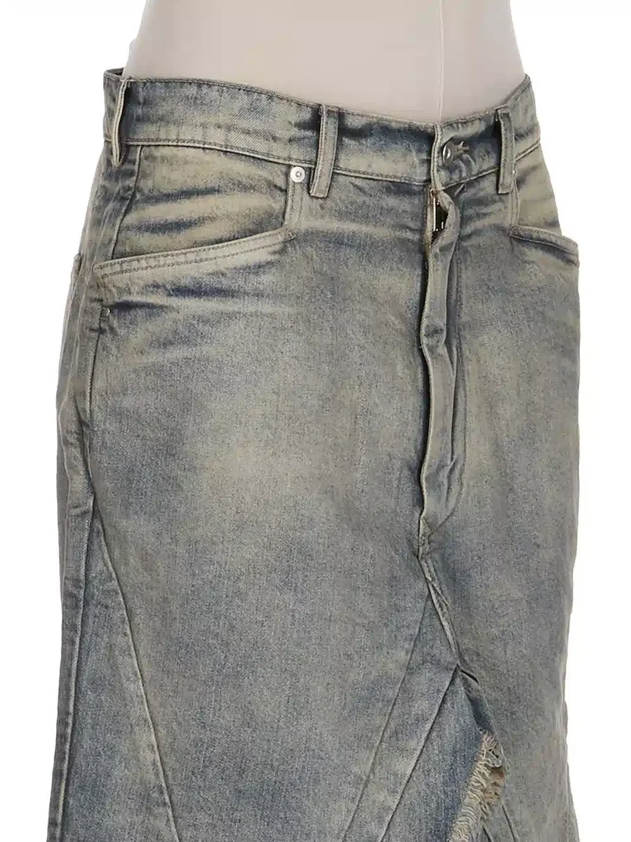 THIS SLIVERED SKIRT IS A KNEE LENGTH 5 POCKET JEAN SKIRT. IT HAS A WAISTBAND WITH CONCEALED ZIP FLY, TOP BUTTON AND BELT LOOPS WITH RIVETS. IT PEAKS SLIGHTLY BETWEEN THE LEGS, TAPERING TO POINTS AT THE KNEE, AND FEATURES ANGULAR GEO PANELS ON THE FRONT THIGHS.