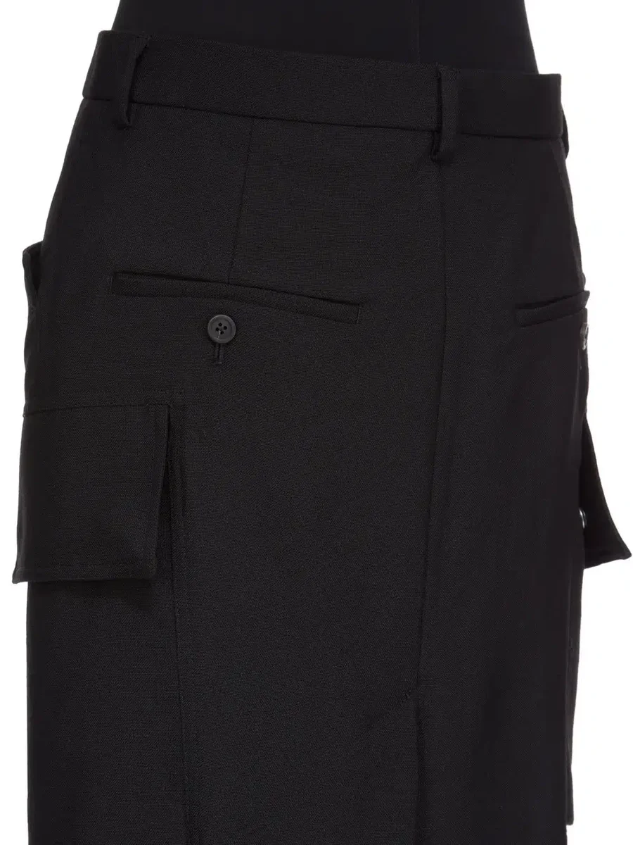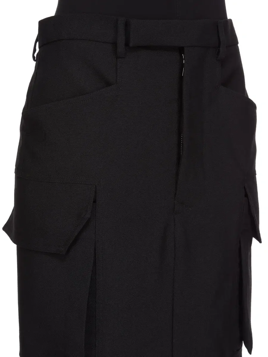 THIS FIRBANKS SKIRT IS MID-CALF LENGTH WITH TOP FRONT MASTODON POCKETS, AND TWO LARGE LOWER THIGH CARGO POCKETS WITH FLAPS. IT FEATURES A WAISTBAND WITH CONCEALED FRONT ZIPPER AND BELT LOOPS, SIDE POCKETS AND BACK POCKETS WITH BUTTONS. THIS VERSION HAS A RAW CUT HEM.