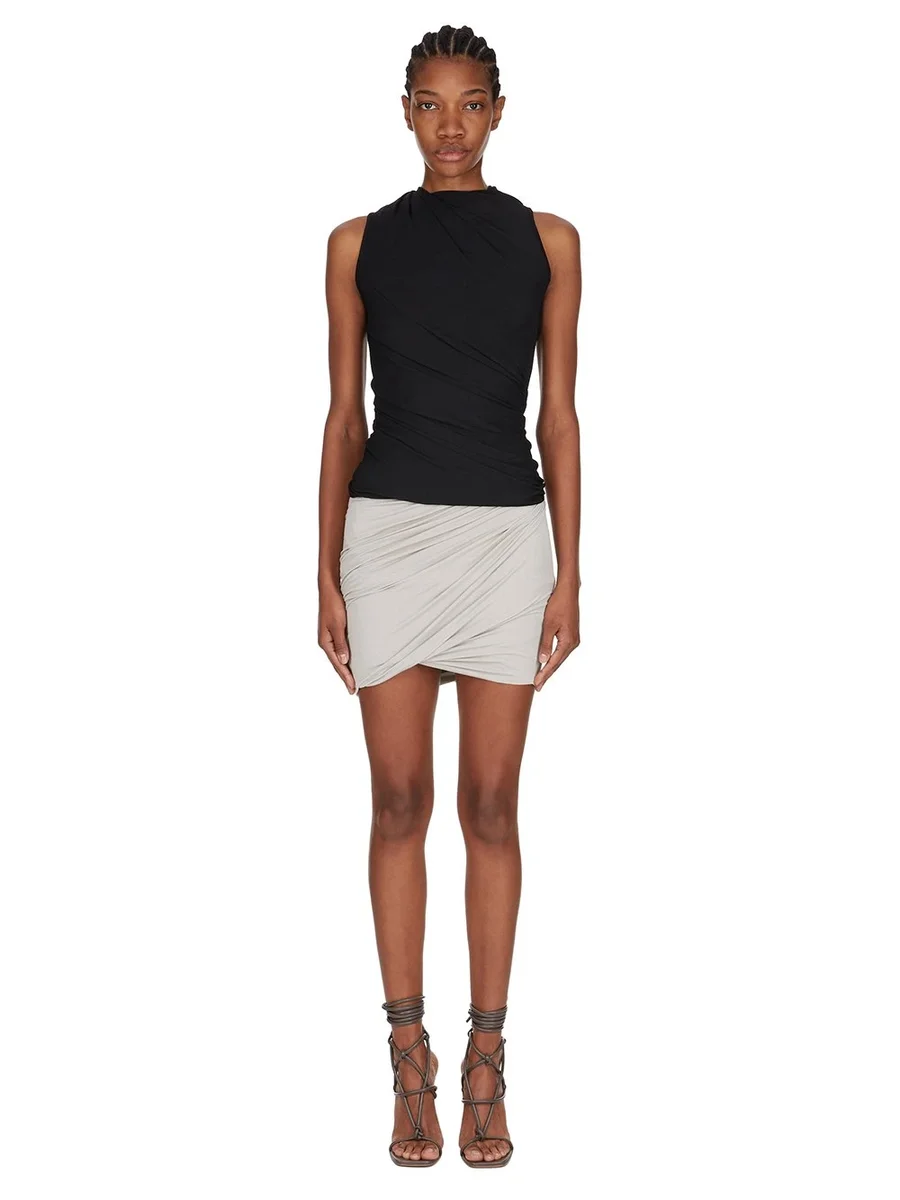 THIS LUNA SKIRT IS MID-THIGH LENGTH WITH AN ELASTICIZED WAISTBAND. IT HAS A BODY HUGGING FIT AND DRAPES ACROSS THE BODY FROM RIGHT TO LEFT ALONG A BIAS SEAM AND MULTIPLE DRAPINGS.