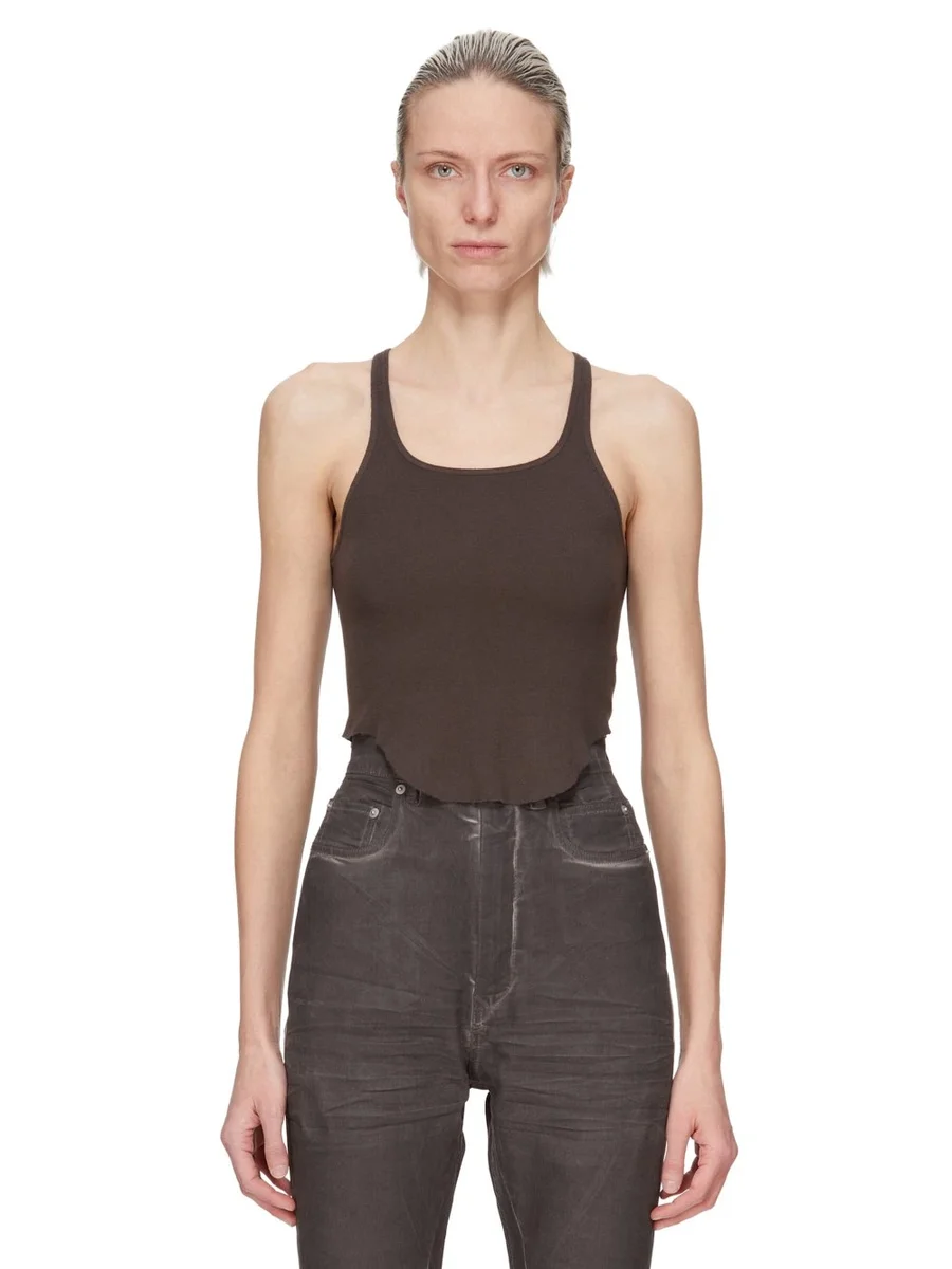 THIS BASIC RIB TANK IS ABOVE WAIST LENGTH WITH A ROUNDED RAW CUT HEM THAT DIPS IN FRONT AND BACK. IT HAS A ROUND NECKLINE AND THIN SHOULDER STRAPS THAT FLOW INTO A SLIGHT RACER BACK. ITS BACK IS SLIGHTLY LOWER THAN THE FRONT. IT FEATURES THE SIGNATURE SINGLE SEAM RUNNING DOWN THE CENTRE BACK SPINE.