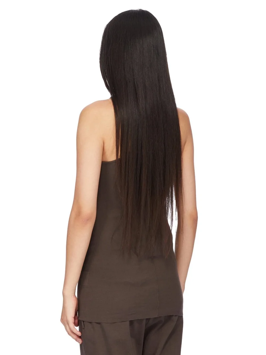 THIS RACER BACK TANK IS HIP LENGTH WITH A STRAIGHT RAW CUT HEM. IT HAS A ROUND NECKLINE AND THIN SHOULDER STRAPS THAT FLOW INTO A RACER BACK. IT FEATURES THE SIGNATURE SINGLE SEAM RUNNING DOWN THE CENTRE BACK SPINE.