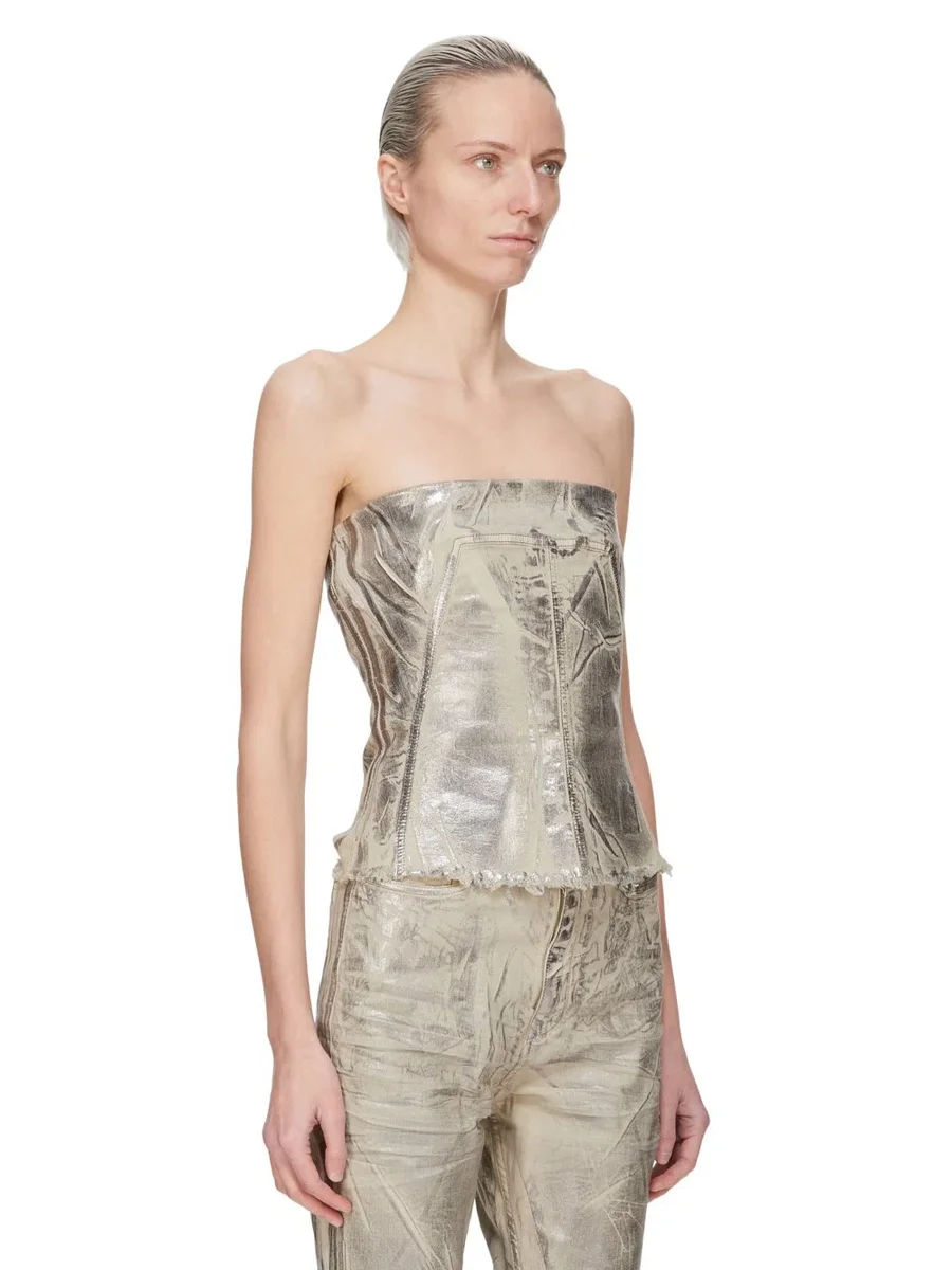 DRKSHDW FW25 CONCORDIANS BUSTIER TOP IN PALLADIUM FOIL STRETCH DENIM