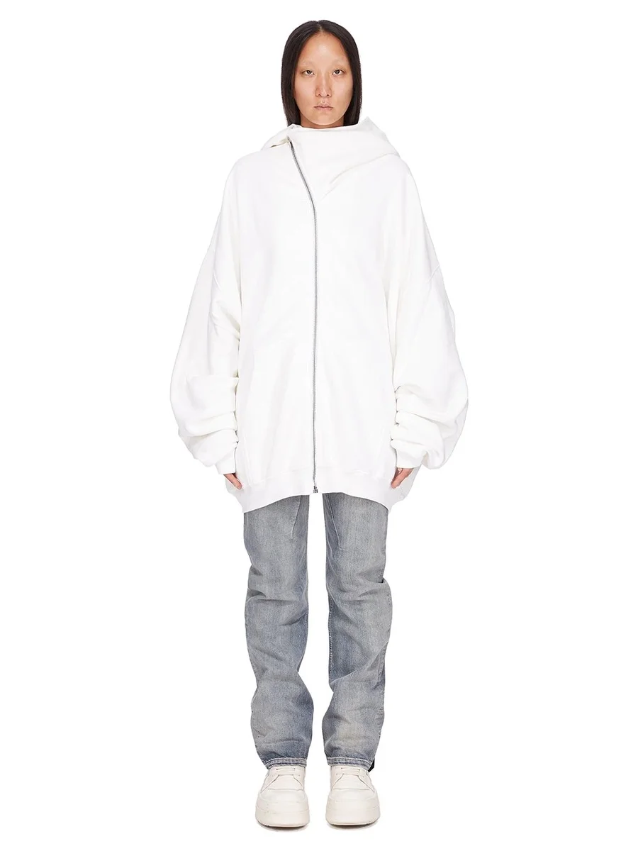 THIS MEGAMOUNTAIN IS BELOW HIP LENGTH WITH LONG SLEEVES AND MEGA OVERSIZED. IT HAS A CURVED ASYMMETRICAL ZIPPER CLOSURE, A SMALL FUNNEL NECK AND A LARGE POINTED HOOD. IT HAS TWO FRONT PATCH POCKETS, AND RIBBED CUFFS AND WAISTBAND.