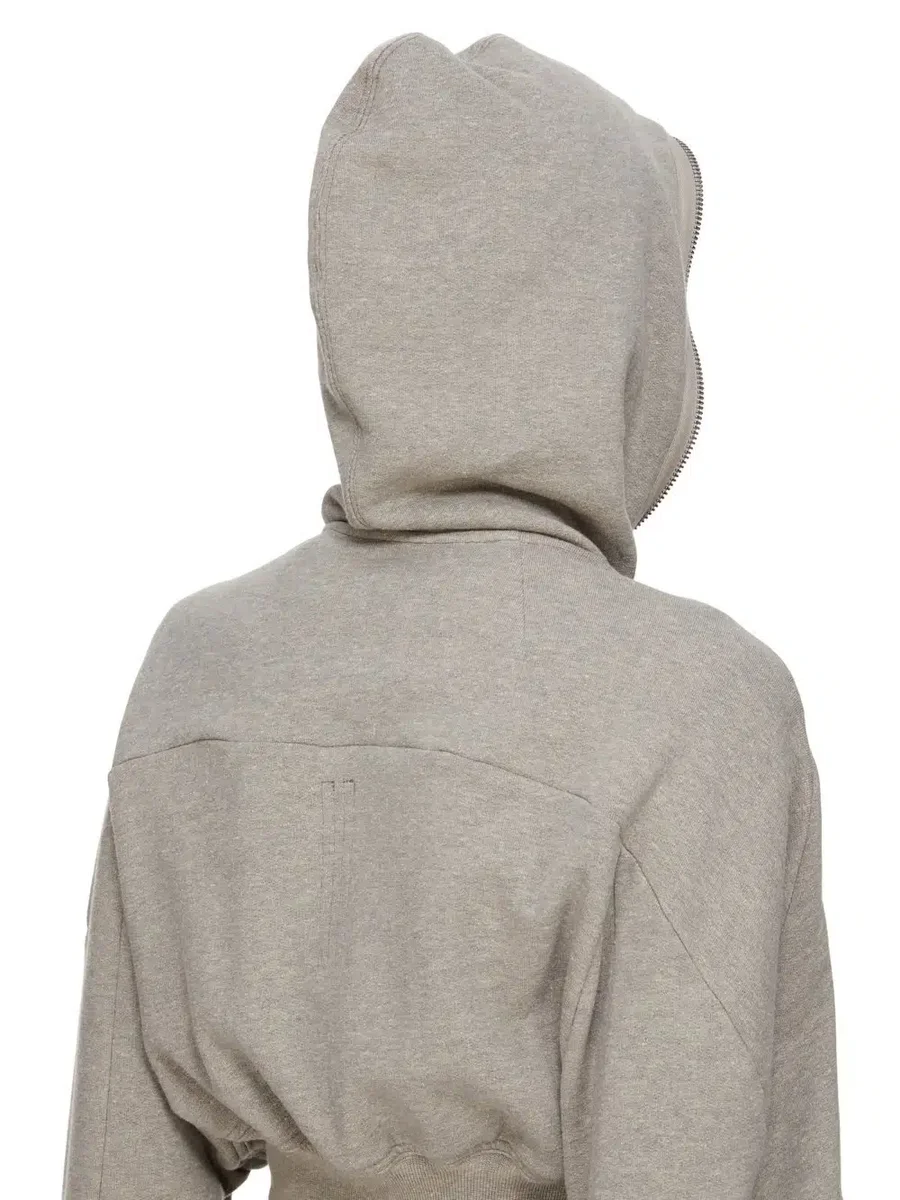 THIS COLLAGE GIMP HOODIE IS CROPPED WAIST LENGTH AND HAS LONG SLEEVES. IT HAS A FRONT ZIPPER CLOSURE WITH EXPOSED ZIPPER TAPE THAT RUNS FROM THE HEM ALL THE WAY UP THROUGH THE HOOD, ALLOWING IT TO BE ZIPPERED COMPLETELY CLOSED OVER THE FACE. IT FEATURES GEOMETRIC GIRDERED SHOULDERS AND STITCHING, A FRONT AND BACK YOKE AND HAS RIBBED CUFFS AND WIDE WAISTBAND.